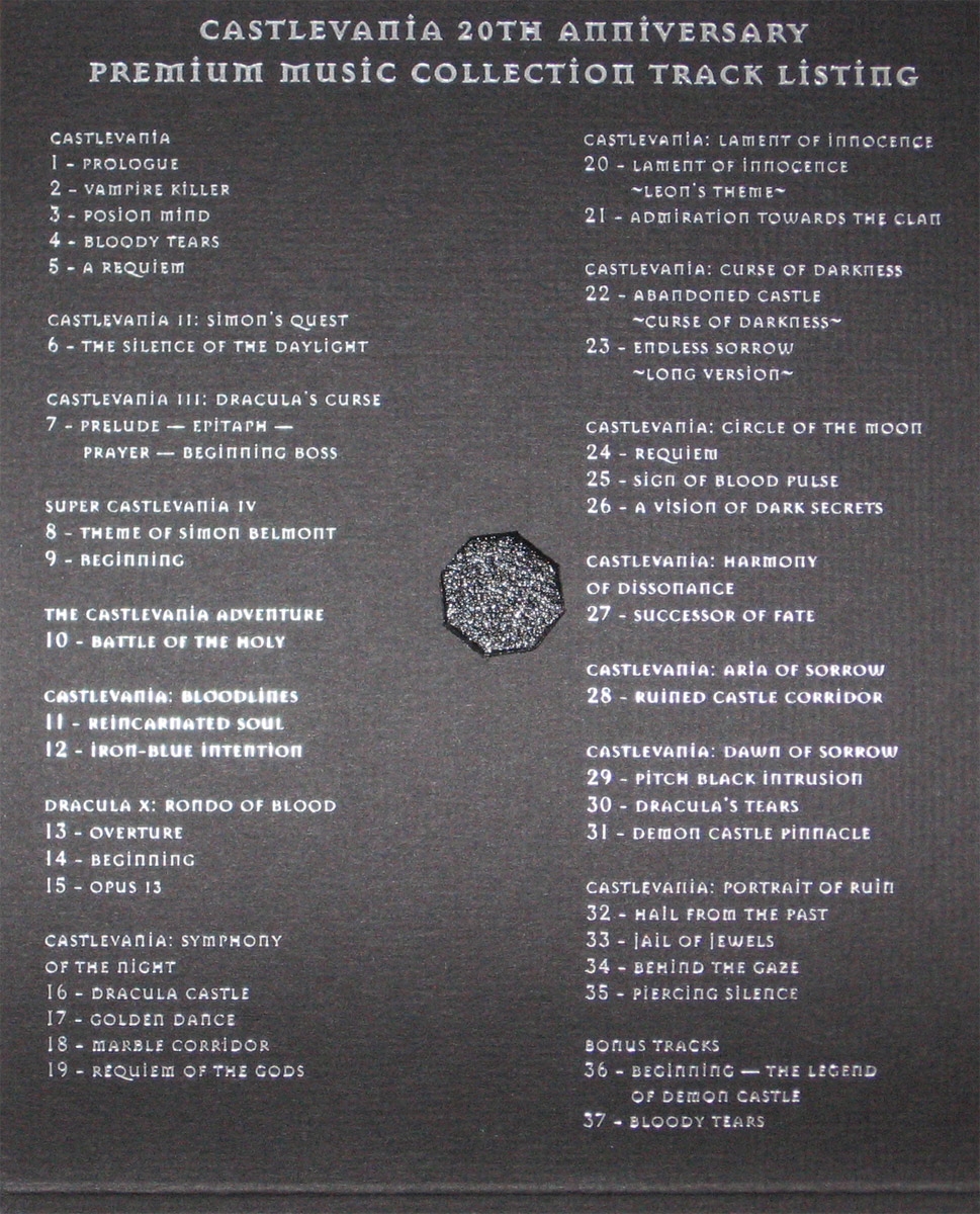 Given to those who pre-ordered Castlevania: Portrait of Ruin in the US. Disc itself is labeled as "Castlevania 20th Anniversary Deluxe Music Collection" but the printed tracklist it came with says "Castlevania 20th Anniversary Premium Music Collection."