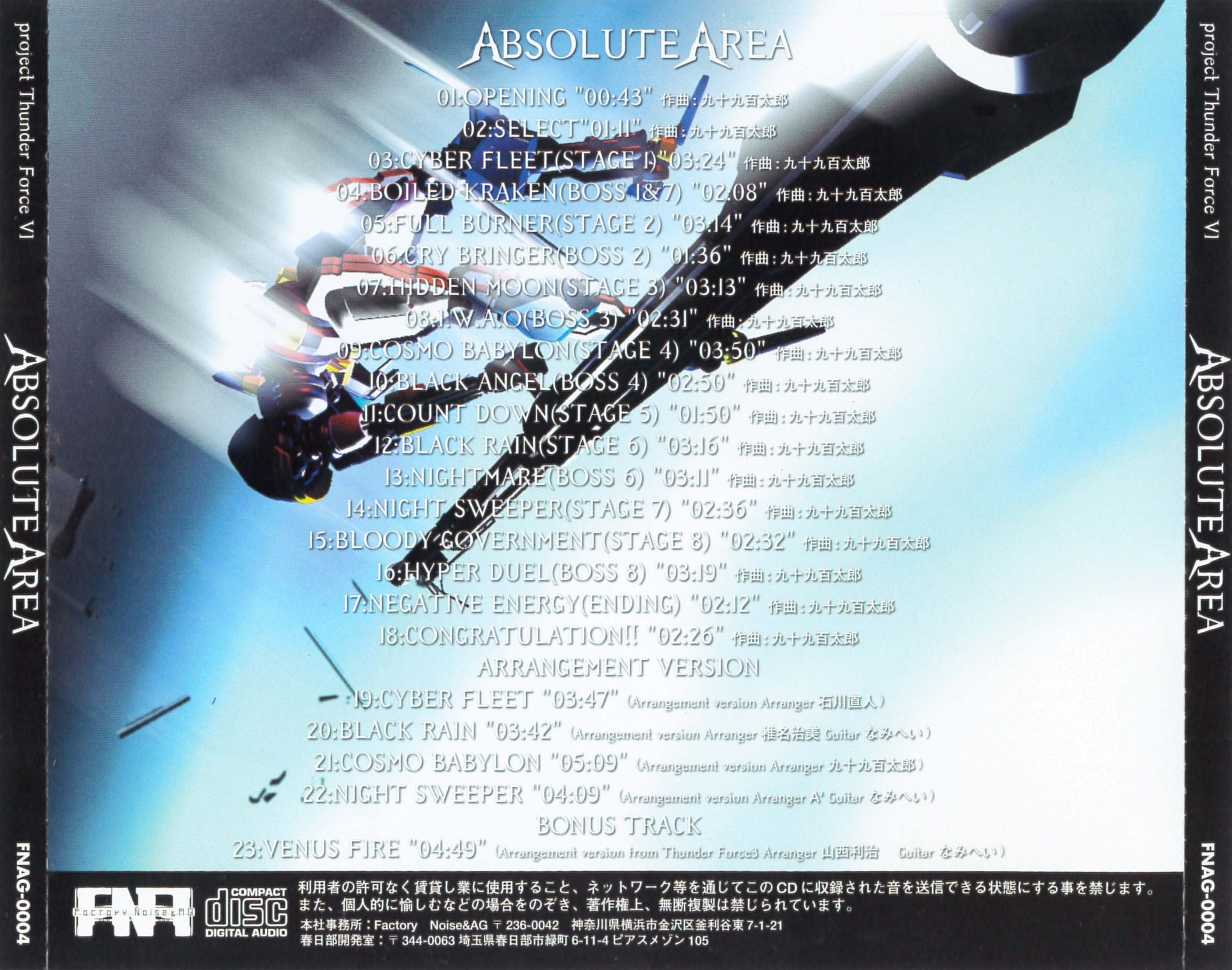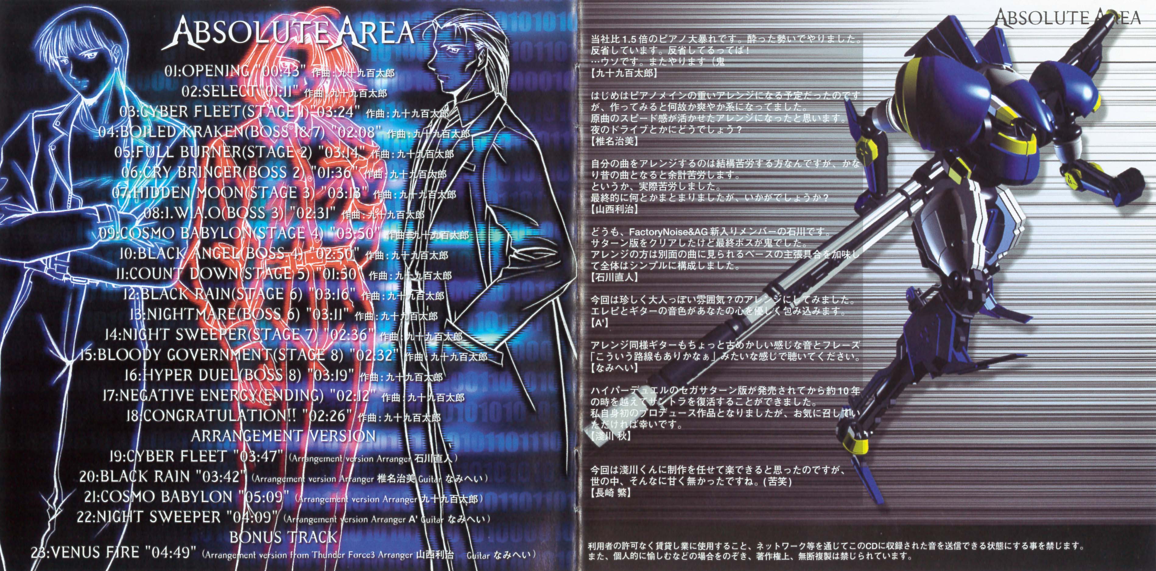 Tracks 1-18 are from Hyper Duel. Tracks 19-22 are the "Arrangement Version," arranged from Hyper Duel. Track 23 is the "Bonus Track," an arrangement from Thunder Force III.