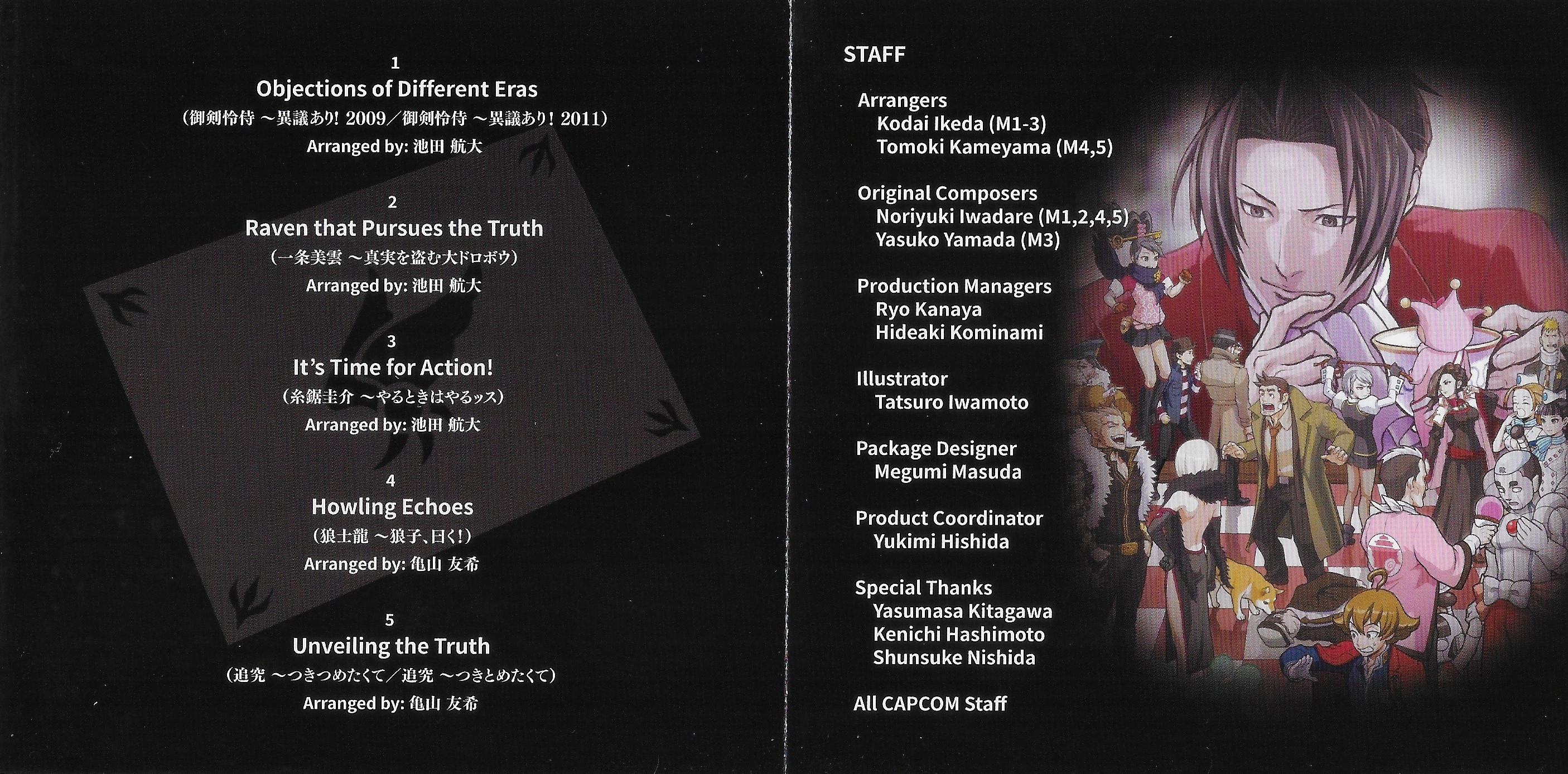 *Note: While the booklet credits Yasuko Yamada for track 3's composition, it is an arrangement of the theme of same name from "Phoenix Wright: Ace Attorney", in turn actually composed by Sugimori. Yamada was responsible for arranging the track in "Ace Attorney Investigations: Miles Edgeworth", and this incorrect composition credit was presumably carried over from there as a result.