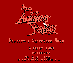 The Addams Family: Pugsley's Scavenger Hunt is a side-scrolling platformer based on the second animated TV series The Addams Family (1992). The entire Addams family is being held captive by various monsters throughout the mansion, and Pugsley needs to rescue them. They are hidden in various parts of the mansion, e.g. the forest, which can be accessed in any order. The gameplay follows the usual platforming standards: Pugsley moves from left to right while jumping a lot and avoiding enemies.