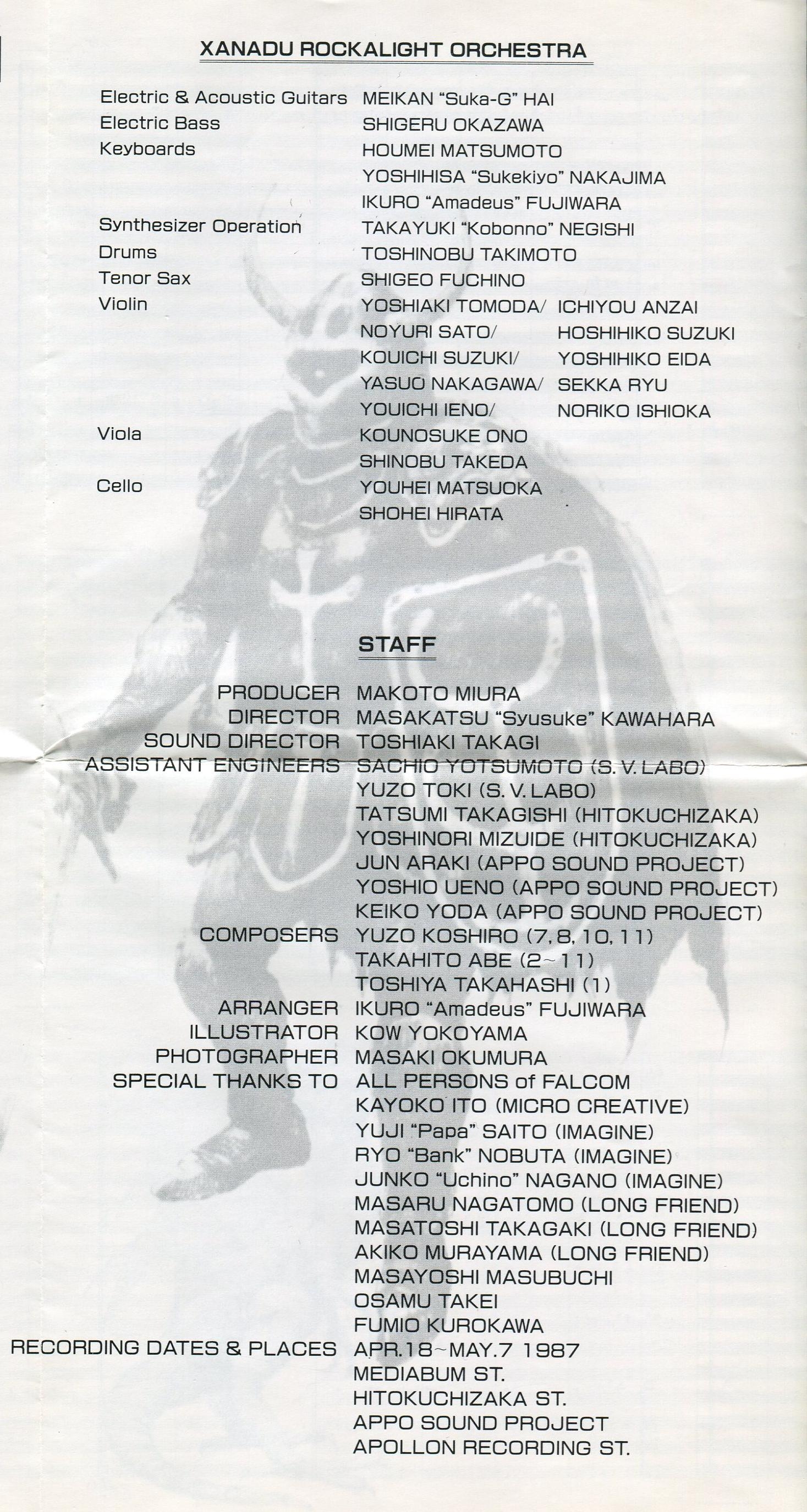 Special Thanks To: All Persons of FALCOM, Kayoko Ito (Micro Creative), Yuji "Papa" Saito (Imagine), Ryo "Bank" Nobuta (Imagine), Junko "Uchino" Nagano (Imagine), Masaru Nagatomo (Long Friend), Masatoshi Takagaki (Long Friend), Akiko Murayama (Long Friend), Masayoshi Masubuchi, Osamu Takei, Fumio Kurokawa
