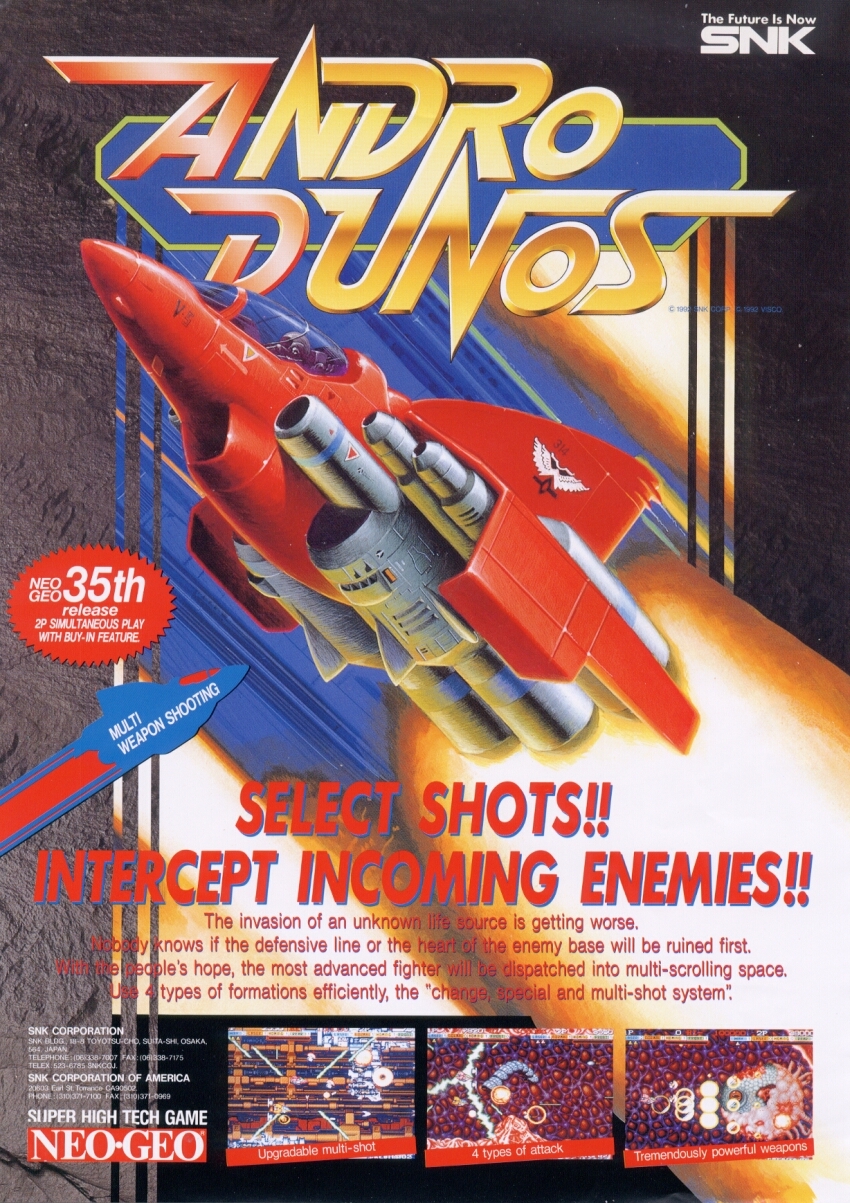 Andro Dunos is a scrolling shoot 'em up game reminiscent of Hellfire and Whip Rush where players take control of the Neo Type space fighter crafts Yellow Cherry (P1) and Red Fox (P2), which are sent by the defense system of Earth across eight levels that take place on a futuristic sci-fi setting, where an unknown alien race from outer space who have steadily increased their invasion activities against humankind that must be eliminated in order to finish a long lasting war as the main objective