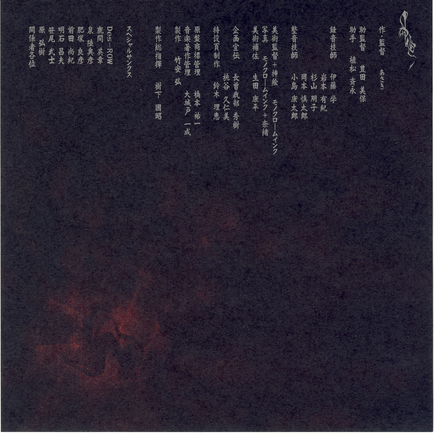 Special Thanks: Des-ROW, Hideaki Shikama, Mutsuhiko Izumi, Yoshihiko Koezuka, Naoki Maeda, Masao Akashi, Takeshi Sasao, 原弘樹, Everyone Involved