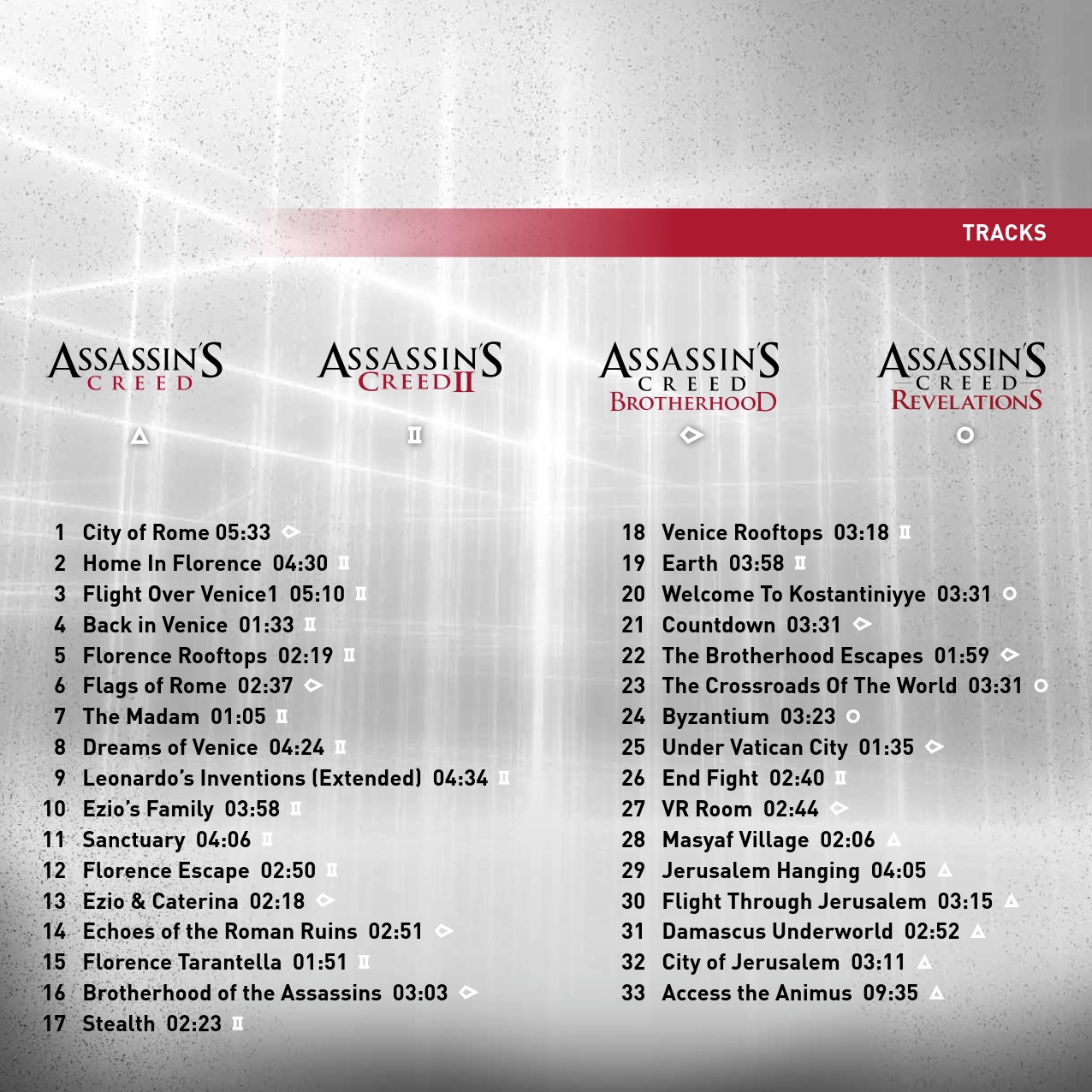 Tr. 02~05, 07~12, 15, 17~19, 26 from Assassin's Creed II