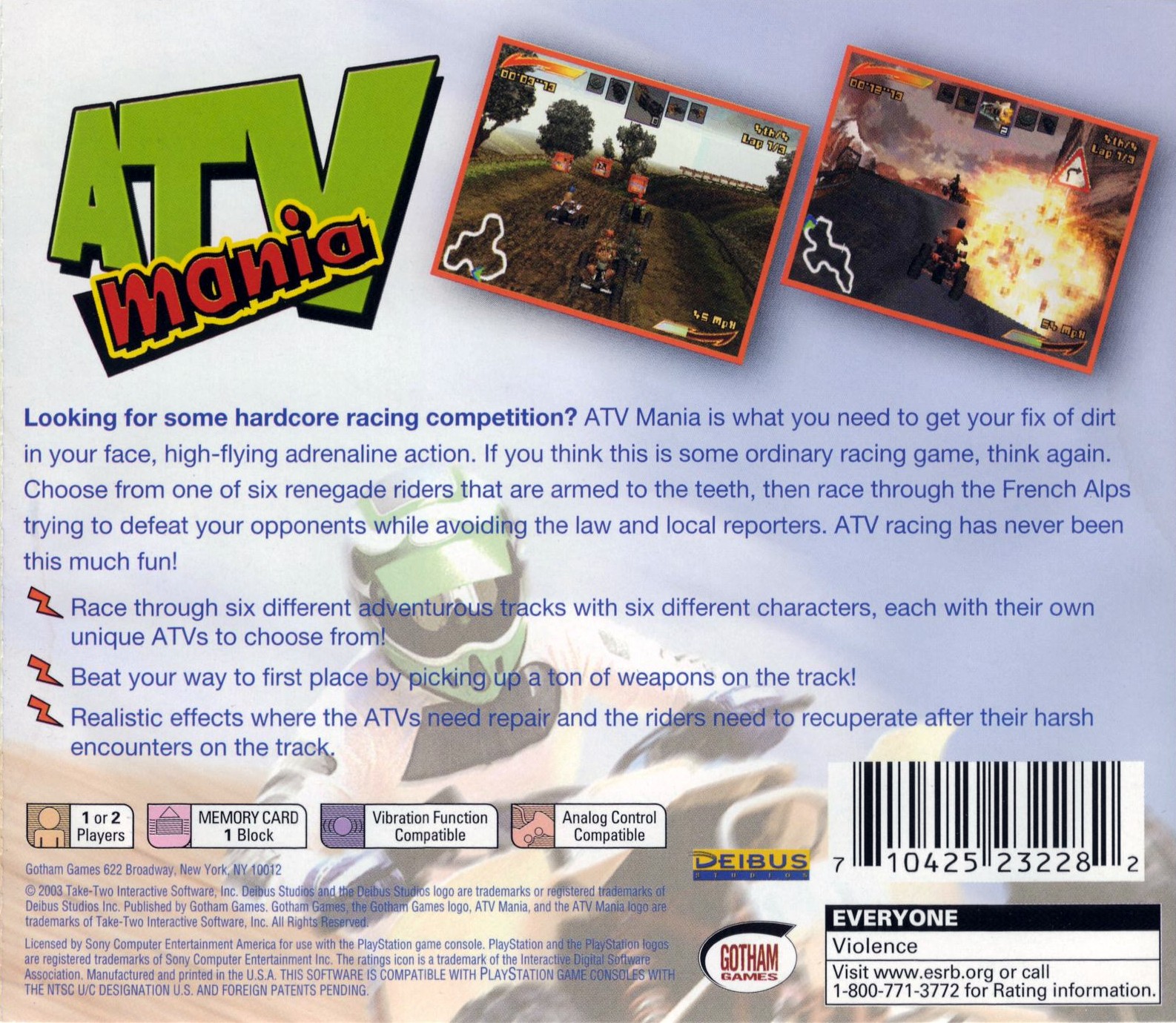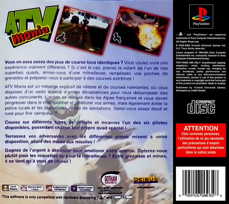 Looking for some hardcore racing competition? ATV Mania is what you need to get your fix of dirt in your face, high-flying, adrenaline action. If you think this is some ordinary racing game, think again. Choose from one of six renegade riders that are armed to the teeth, then race through the French Alps trying to defeat your opponents while avoiding the law and local reporters. ATV racing has never been this much fun.