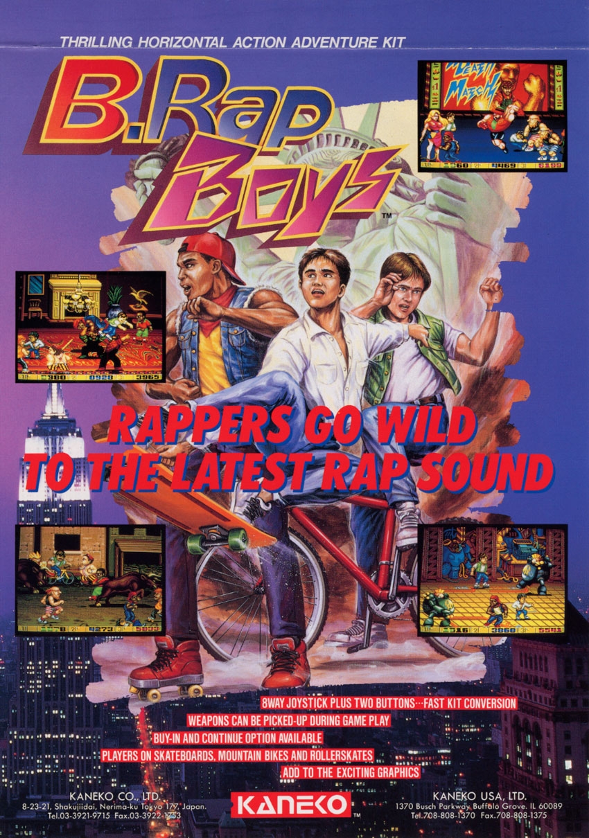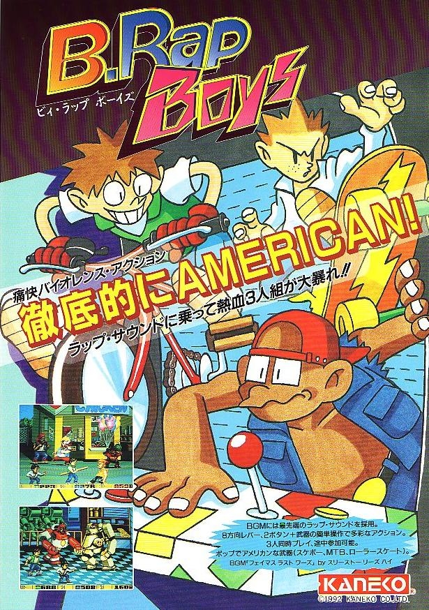 B.Rap Boys is a 2D side-scrolling beat 'em-up game that puts players in the shoes of either a roller skater, skateboarder or mountain biker. You take on a challenge to determine who is the ultimate warrior. The game is similar to DJ Boy.