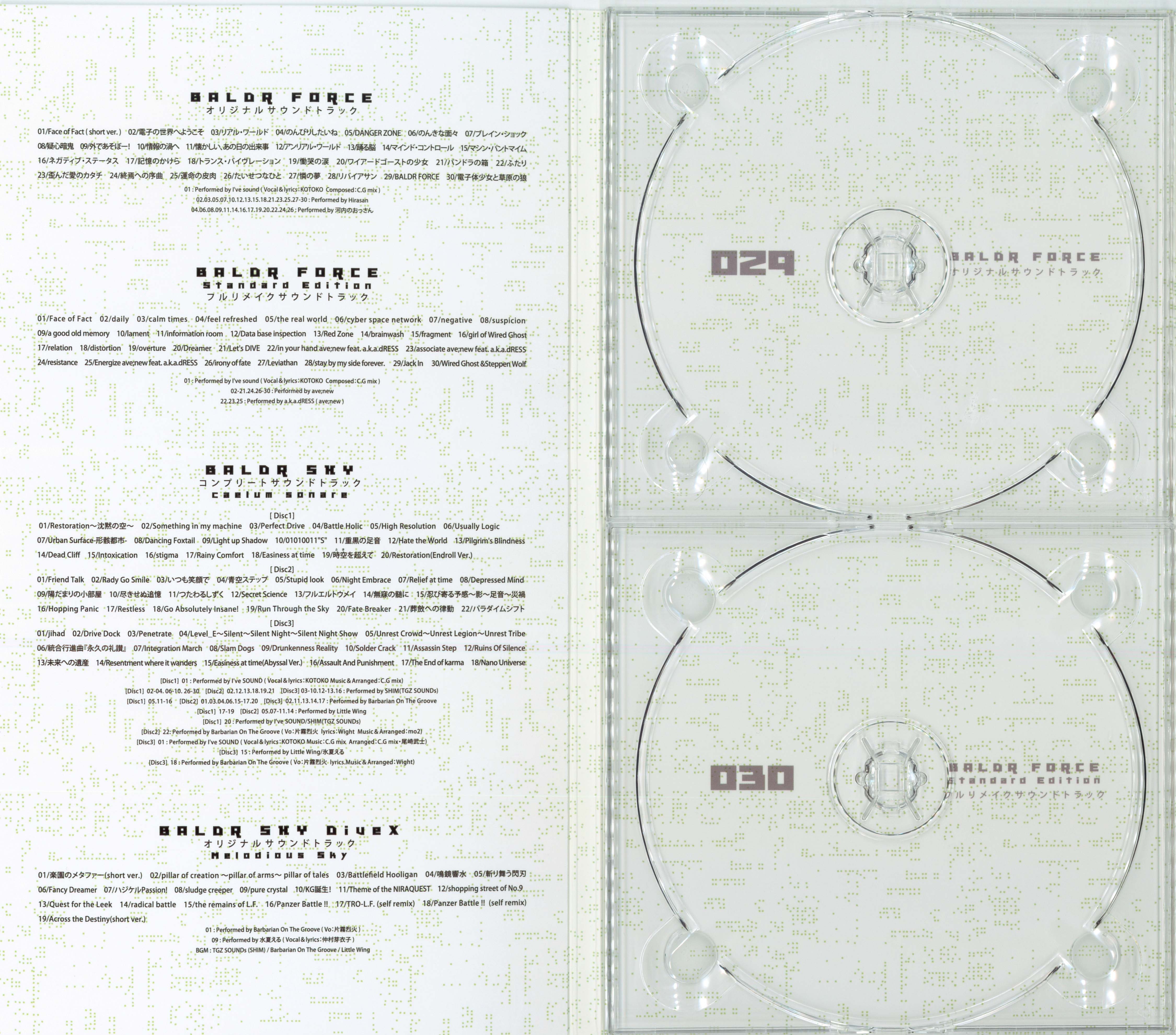 *Note in the Booklet it claims SHIM performed on tracks 26-30 of Disc 1, however there's only 20 tracks on Disc 1. It also claims Barbarian On The Groove worked on track 13 of Disc 3, however according to the notes of "caelum sonare: BALDR SKY Complete Soundtrack" only SHIM is credited.*