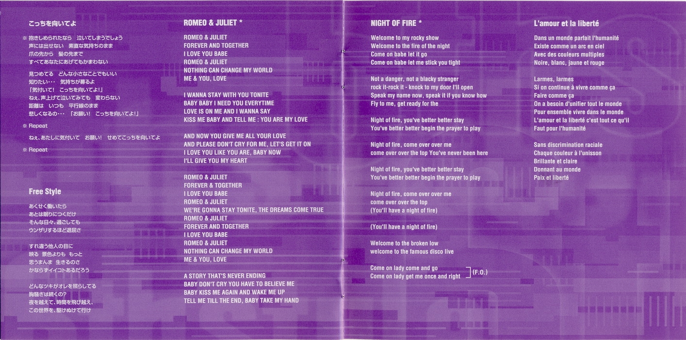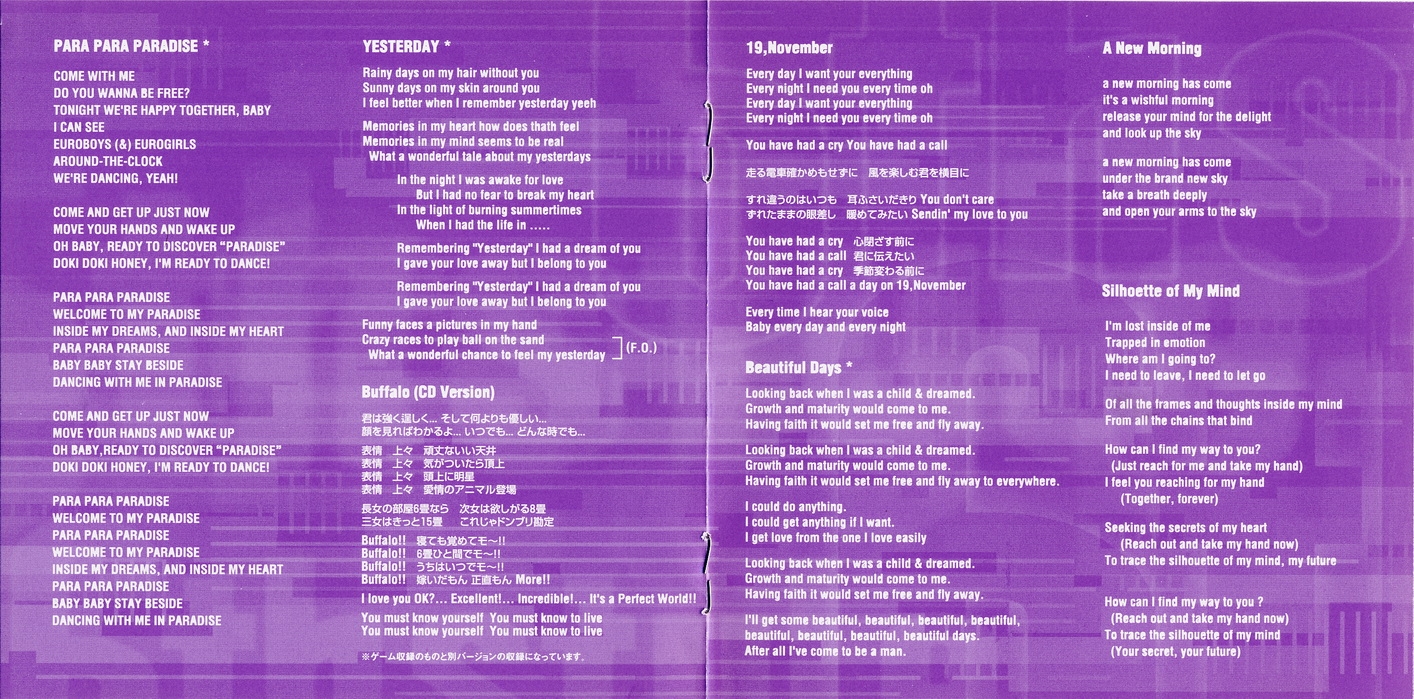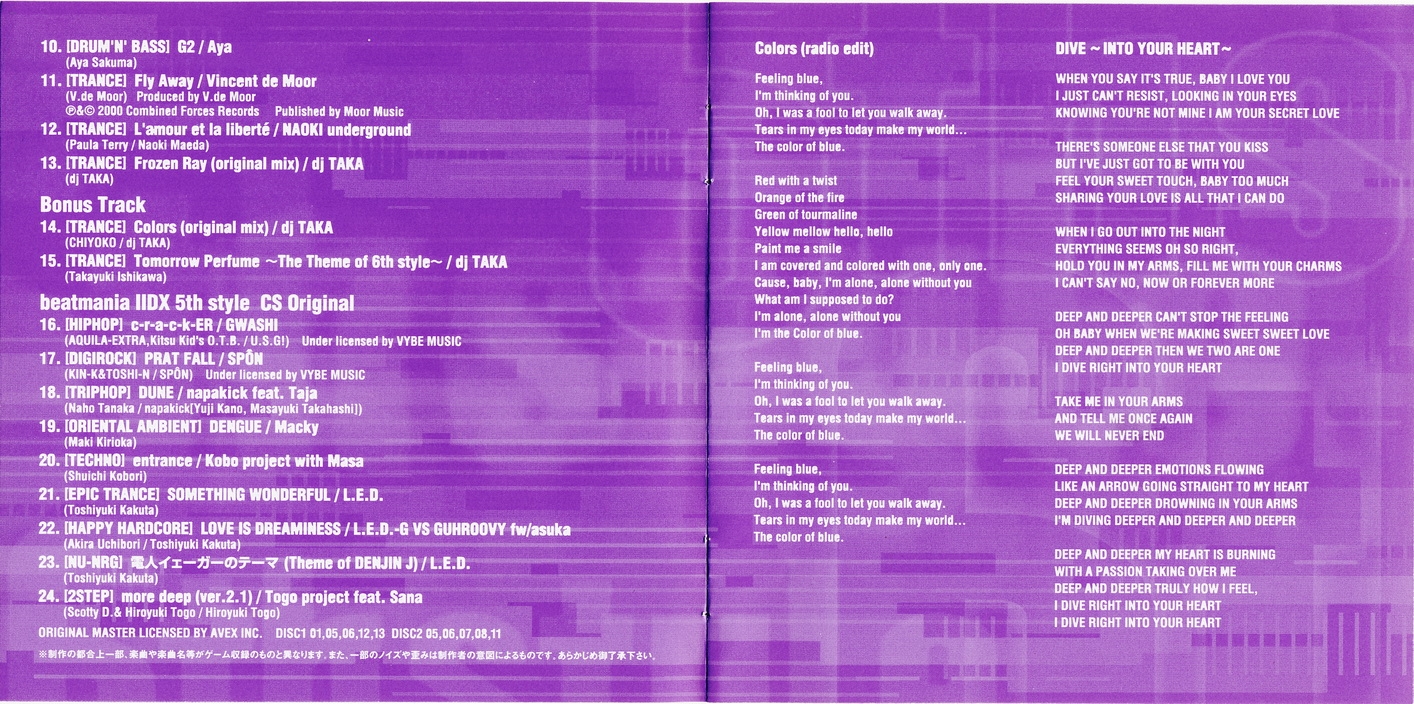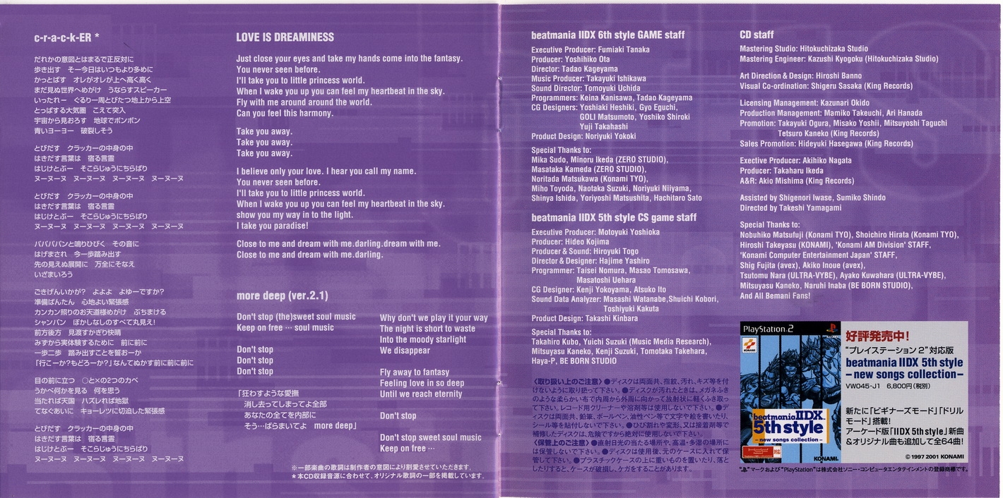Special Thanks to: Nobuhiko Matsufuji (Konami TYO), Shoichiro Hirata (Konami TYO), Hiroshi Takeyasu (KONAMI), 'Konami AM Division' STAFF, 'Konami Computer Entertainment Japan' STAFF, Shig Fujita (avex), Akiko Inoue (avex), Tsutomu Nara (ULTRA-VYBE), Ayako Kuwahara (ULTRA-VYBE), Mitsuyasu Kaneko, Naruhi Inaba (BE BORN STUDIO), And All Bemani Fans!