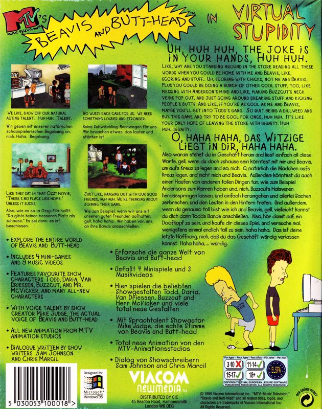 Beavis and Butt-Head in Virtual Stupidity is a point-and-click adventure based on MTV's Beavis & Butt-head series. The player can control both characters as they attempt to join Todd's gang. Much of the gameplay consists of inventory-based puzzles. There are also a few mini-games and hidden music videos.