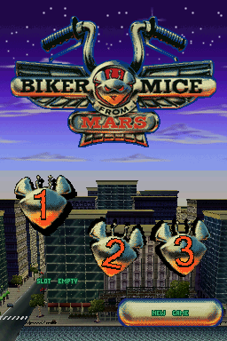 Biker Mice From Mars is a hybrid of a racing game, and a side-scrolling beat-em-up. Take the role of Vinnie, Modo or Throttle, and race against opponents as well as beating them up in your quest to rescue the planet Mars. During the racing sections of the game, you can fire rockets at your foes (once collected from crates scattered on the track), or boost ahead of opponents. You're also racing against a time limit, and must make it to the end of the track before time is up. Destroying enemies will add precious seconds to your timer.
