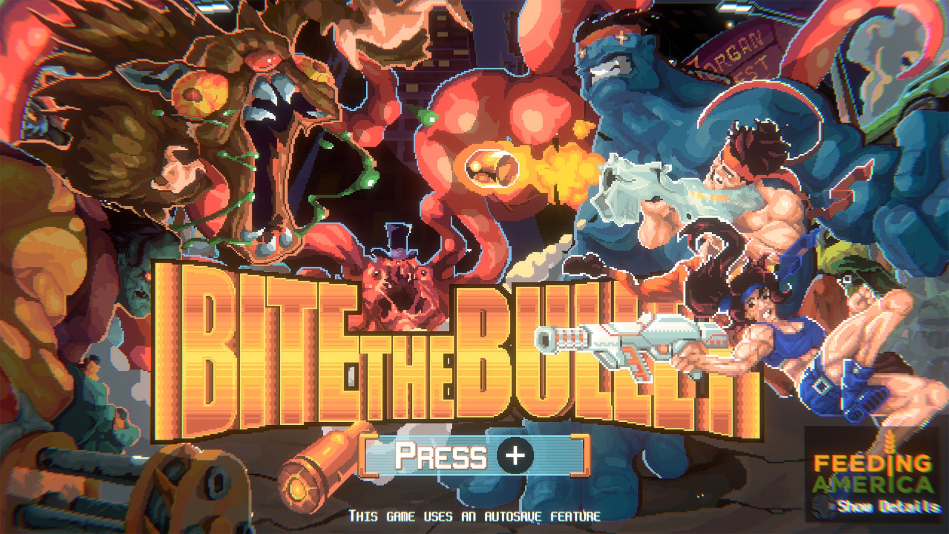 Bite the Bullet is a platform game in which players control a mercenary with the ability to consume enemies and parts of the environment. As the player progresses through the game, they are given the option to upgrade their character's attributes and abilities, such as the ability to freeze attacking enemies, via several diet-based skill trees and character classes.