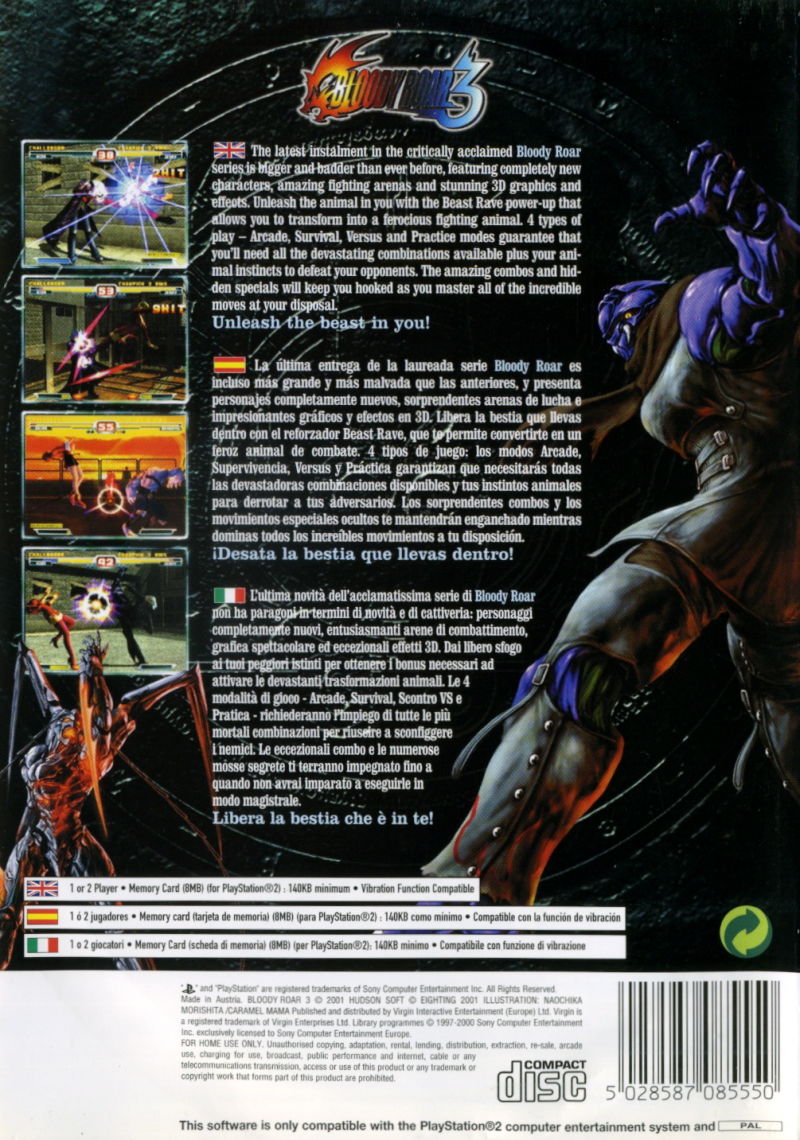 The main feature of Bloody Roar 3 is the ability to transform into beasts, which is involved in all of the Bloody Roar games. Once the character transforms, they regain part of the health they have lost and become much stronger and more powerful than before.