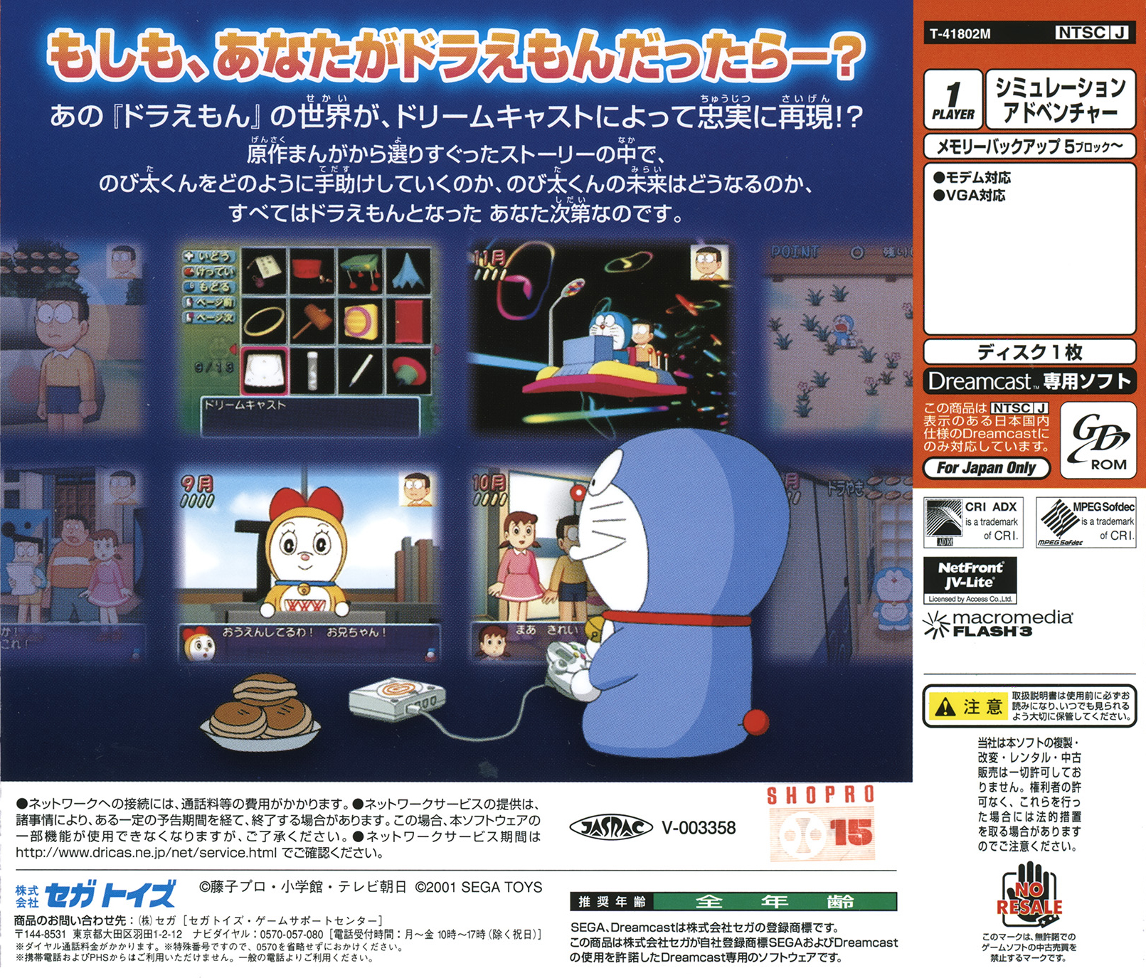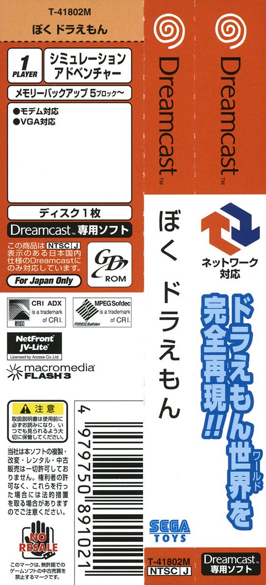 Boku Doraemon is a Japan only Adventure / Simulator game released on the Sega Dreamcast in 2001, You play as Doraemon and help out Nobita with various tasks to make sure he'll have a good future