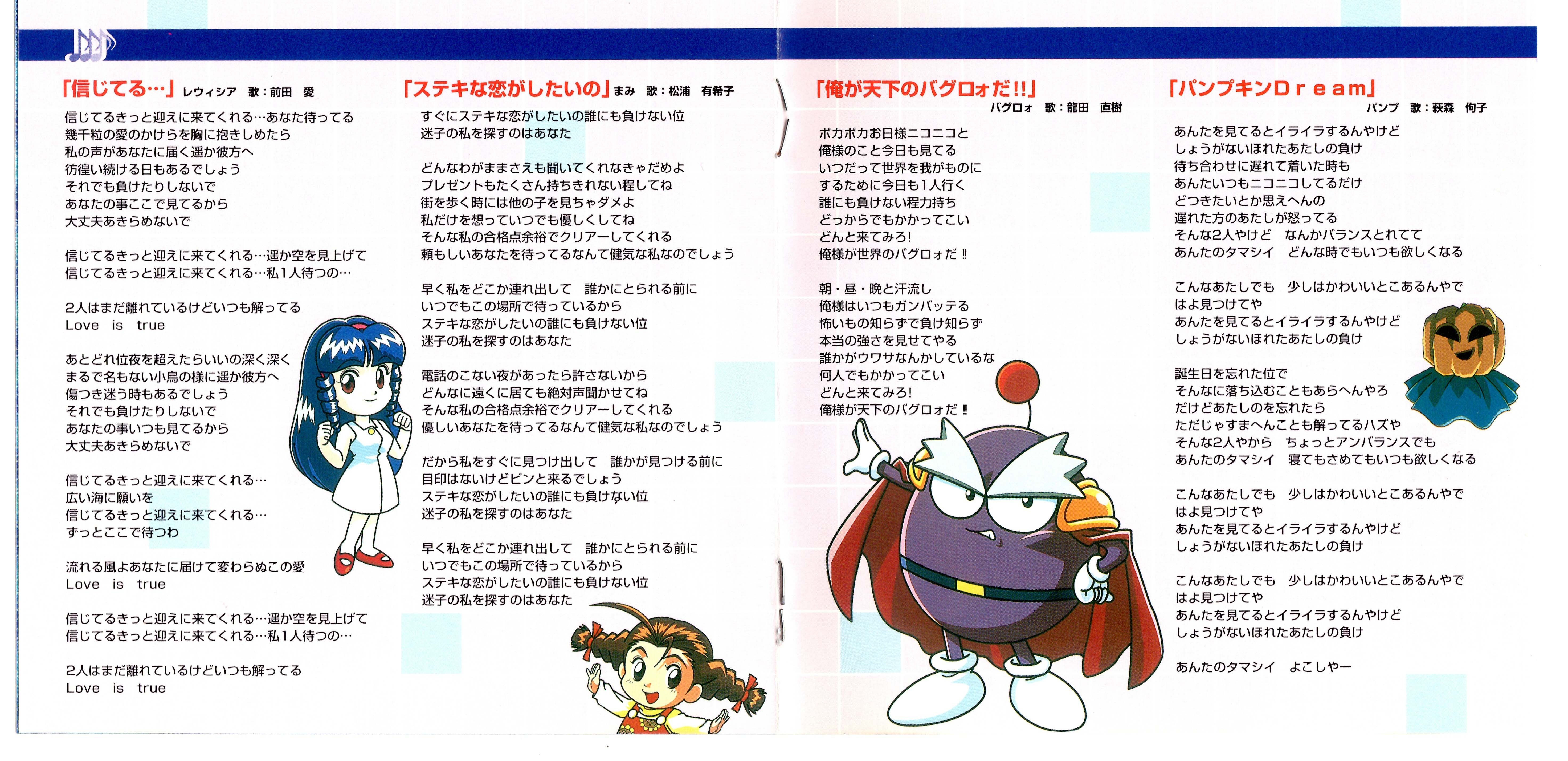 SPECIAL THANKS: SHIGEKI FUJIWARA (HUDSON), MAKOTO SUZUKI (COMPOZILA), MASATO SHIBATA (HUDSON), TAKESHI IKENOUCHI (HUDSON), YUKIKO HANDA (HUDSON)