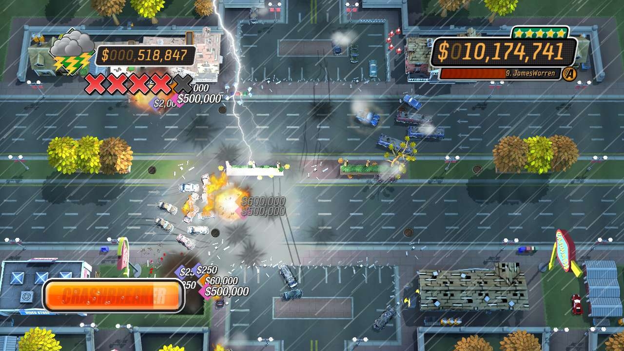 Basically you drive a car, crash onto a traffic one and then you try to get the highest score by exploding your car many times as positive while you get points damaging the level props and exploding other cars. Once you get your final score you can summon a "Super Feature" as an score boost, there's 7 in total (tidal wave, tornado, plane crash, asteroid crash, UFO and a giant lobster) to leave in ruins an entire city while you sum a huge amount of points while you hear a ton of stimulating sound effects of slot machines.