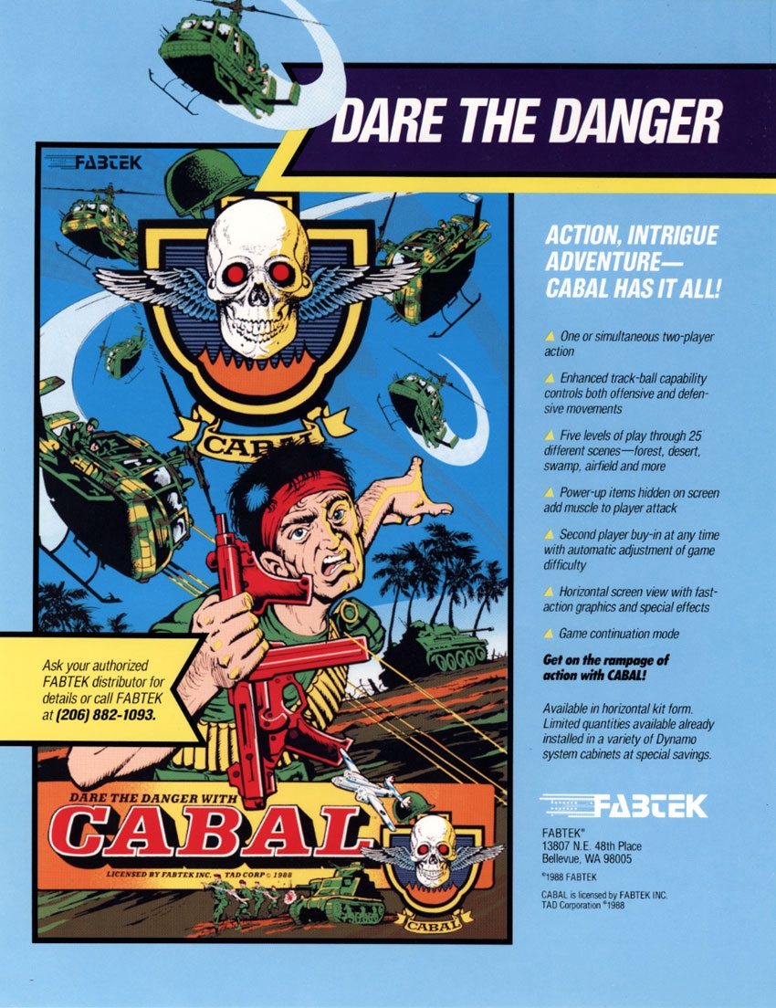 Cabal has one-player and two-player modes of gameplay. Each player assumes the role of an unnamed commando trying to destroy several enemy military bases. There are five stages with four screens each. The player starts with a stock of three lives and uses a gun with limitless ammunition and a fixed number of grenades to fend off enemy troops and attack the base. The commando is seen from behind and starts behind a protective wall which can be damaged and shattered by enemy fire. To stay alive, the player needs to avoid enemy bullets by running left or right, hiding behind cover, or using a dodge-roll. An enemy gauge at the bottom of the screen depletes as foes are destroyed and certain structures (which collapse rather than shatter) are brought down. When the enemy gauge is emptied, the level is successfully completed, all of the remaining buildings onscreen collapse, and the player progresses to the next stage. If a player is killed, he is immediately revived at the cost of one life or the game ends if they have no lives remaining. Boss fights, however, restart from the beginning if the only remaining player dies.
