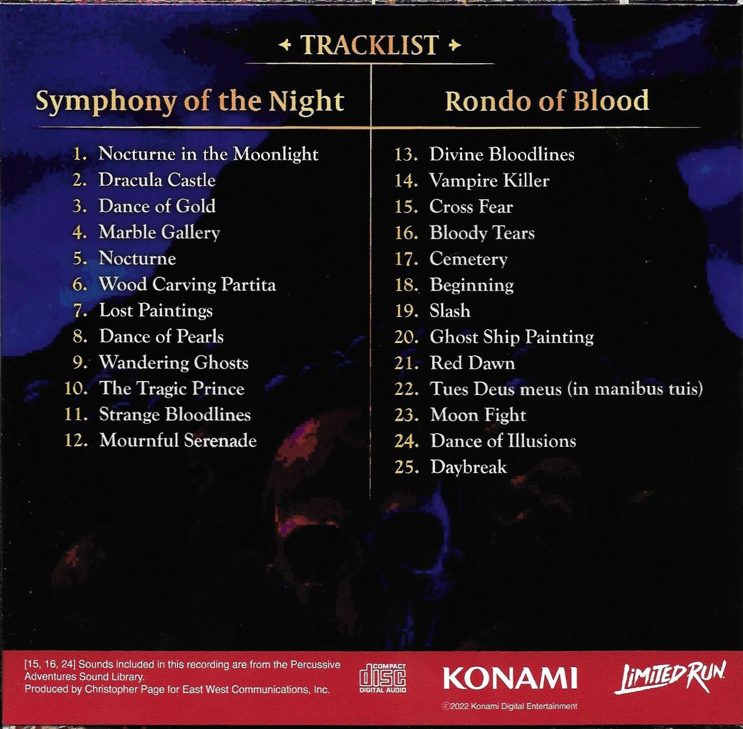 Selections from Symphony of the Night and the PSP remake of Rondo of Blood, even though the PC-Engine original is what is on the game disc.