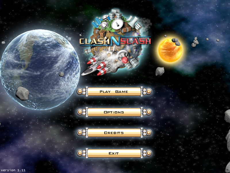Clash'N Slash is a top-down, single screen game where the player needs to protect the planet from an onslaught of enemies by using a spaceship that shoots the enemies. There are different weapons and upgrades for the planet, for the spaceship and for the weapons that help to protect the planet and attack the enemies easily. Power-ups are dropped to use against enemies. There are 60 levels, 13 bonus levels and bosses. The game is entirely controlled by the mouse. Clicking and pointing is used to shoot and the ship will also slightly move in that direction, but it always stays in the vicinity of the planet.