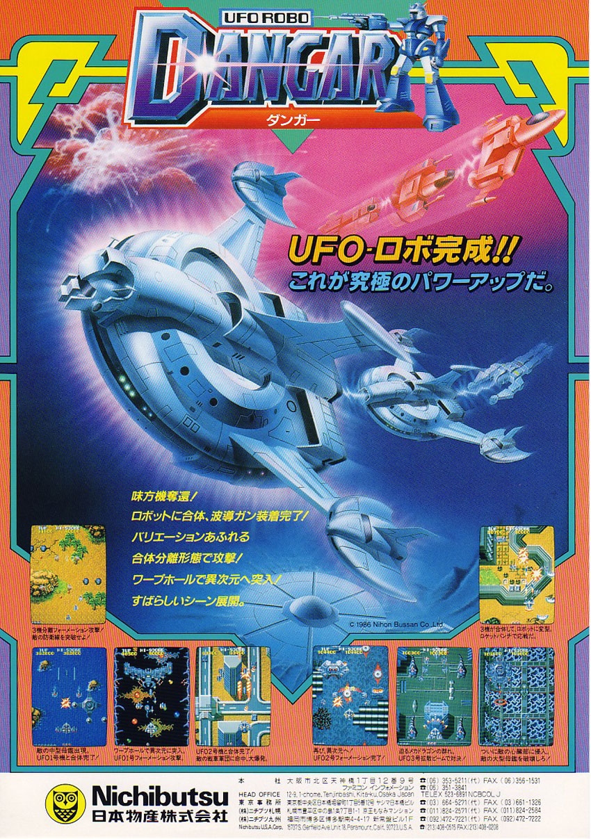 UFO Robo Dangar is a vertically scrolling shooter arcade video game released by Nichibutsu in 1986. It is a spinoff of the Cresta Series, which includes Moon Cresta, Terra Cresta and Terra Force. The game is inspired by the anime series UFO Robo Grendizer and Danguard Ace.