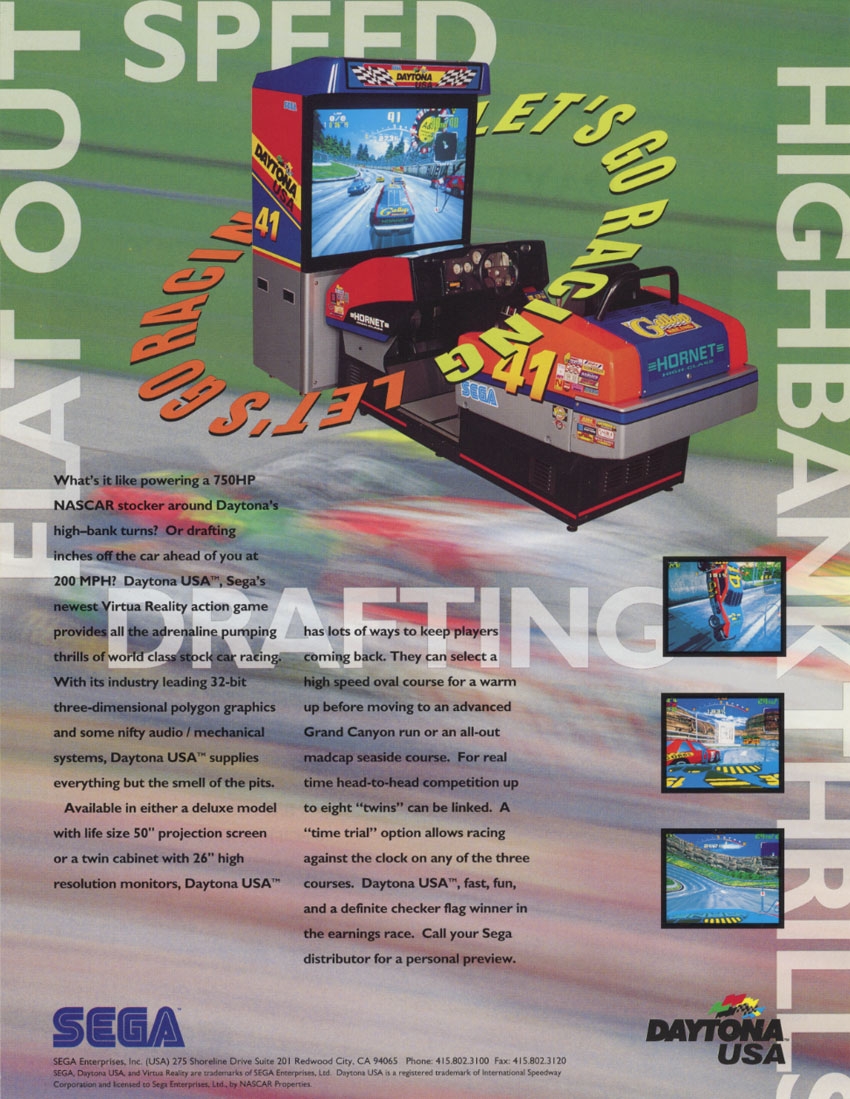 In Daytona USA, the player drives a stock car known as the Hornet. The player's objectives are to outrun the competing cars and complete the race before time runs out, passing checkpoints to collect more time. Players begin in last place and compete against a field of up to 39 computer-controlled cars, dependent on the course selected. Three courses are available for play: Beginner, Advanced, and Expert, also known respectively as Three Seven Speedway, Dinosaur Canyon, and Seaside Street Galaxy. Adaptive difficulty is used; the first lap of each race measures the skill of the player and adjusts the difficulty of opponents accordingly. For less skilled players, opposing cars open lanes for the player, while higher-skilled players have to deal with opponents that block their path. The game's physics include realistic driving mechanics, including drifting and power sliding. The steering wheel in the arcade cabinet uses force feedback so players feel collisions and bumps. Shifting is performed with an H-type shifter.