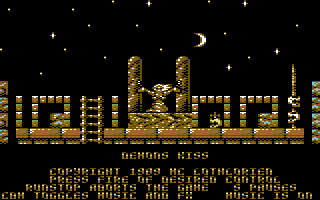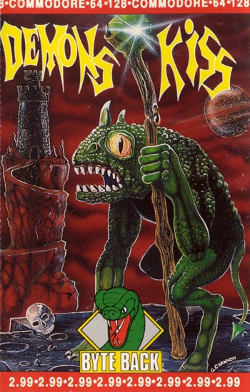 Demons Kiss is a side view flick-screen game where you control a warrior exploring a castle to rescue a beautiful maiden called Alicia from a Demon Harpy. You are armed with a magic ball which can be used to hit various creatures and demons, as well as your hands and feet to kick and punch. You have an energy bar which decreases when you are hit and when it is empty then you lose one of three lives. The castle itself is made up of numerous rooms and ladders can be climbed up or down to reach new parts of the castle. Occasionally you will come a cross a demon blocking a route and you must fight them to kill them to move onwards. The demon also has an energy bar which you need to empty to kill him. A part of the castle is a maze with many identical looking rooms that needs to be navigated in your quest to rescue Alicia.