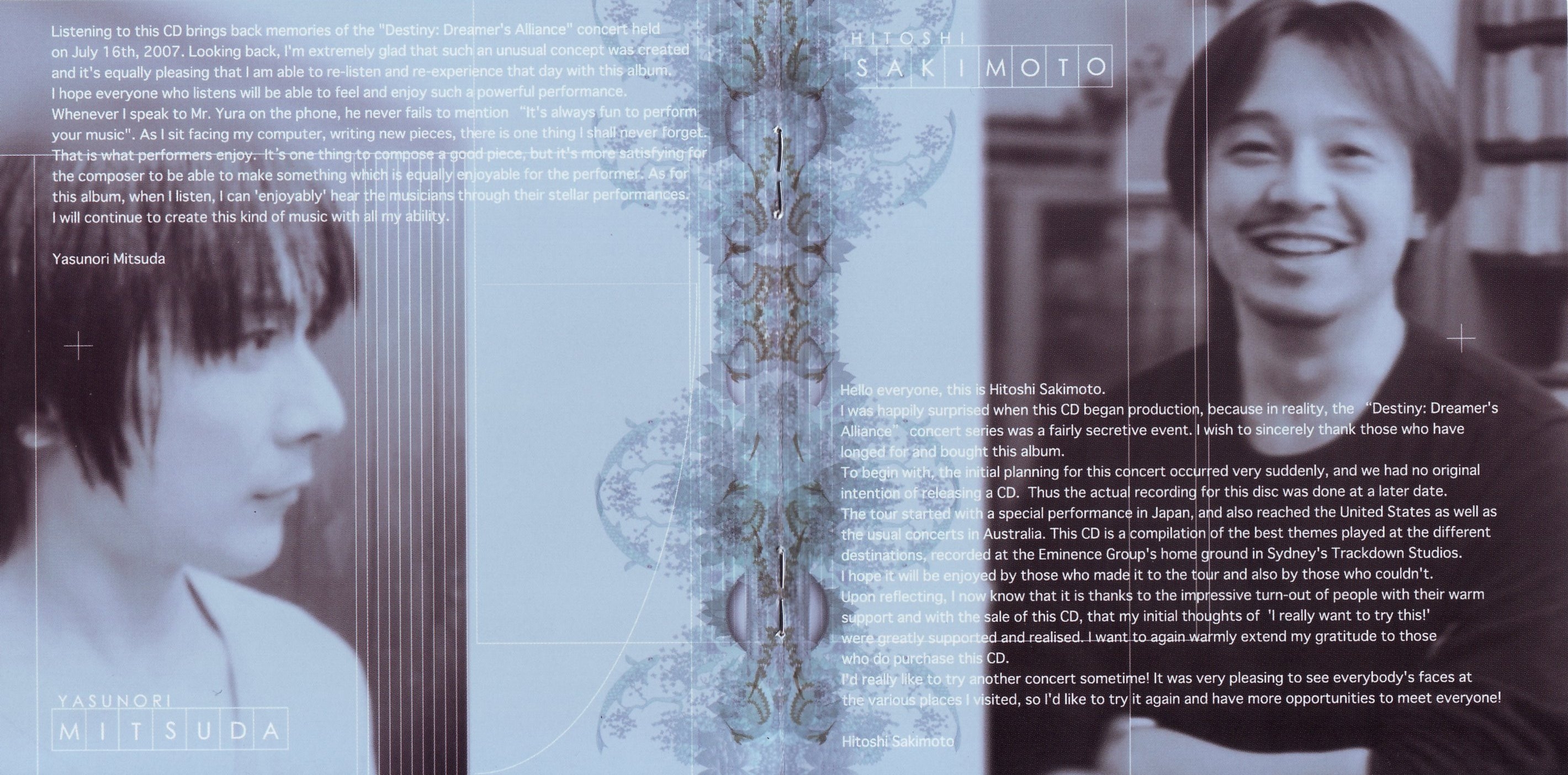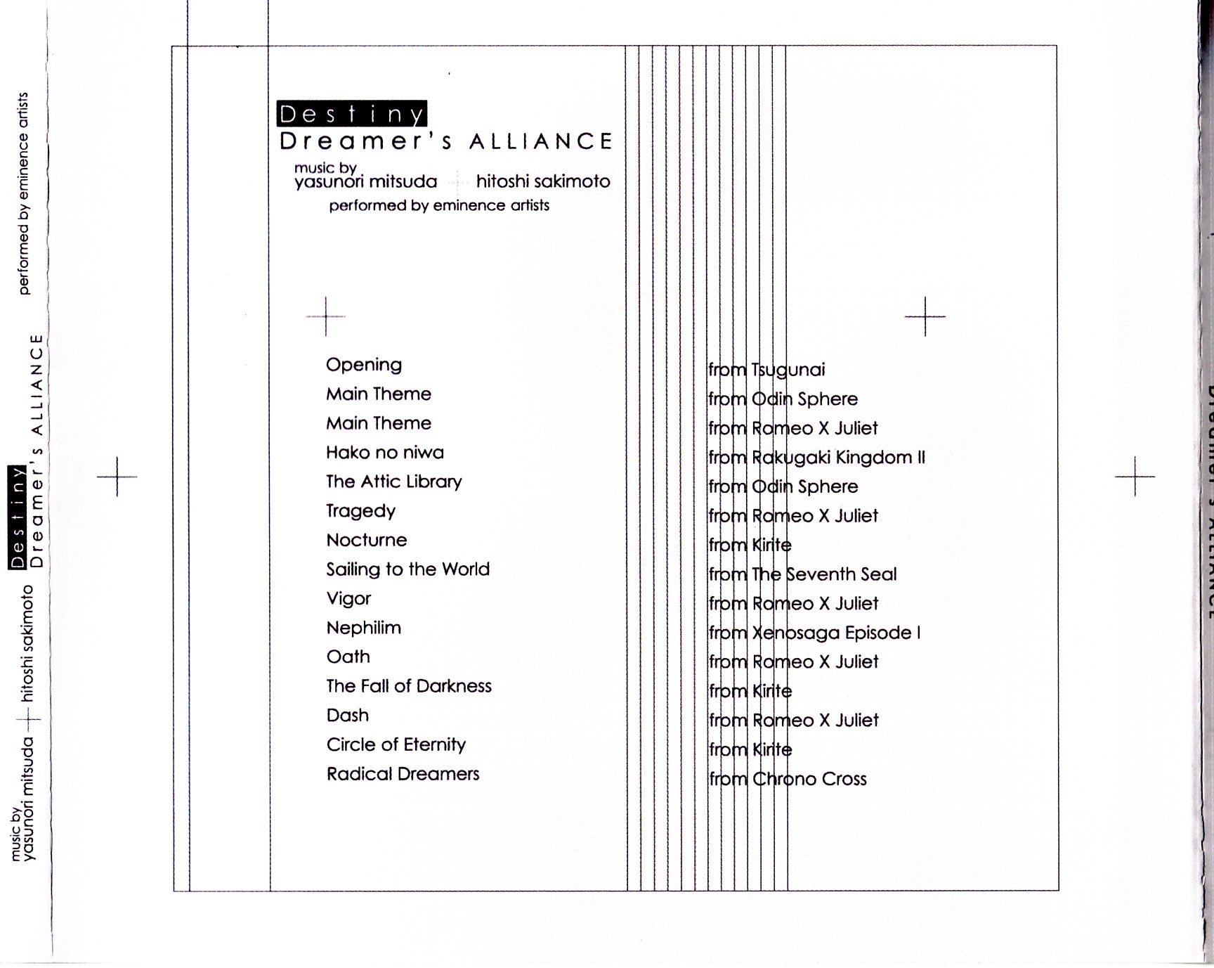 このアルバム『Destiny: Dreamer's Alliance』では、人気作曲家、崎元仁氏と光田康典氏の協力を得て、昔懐かしい名曲から最新作までの、数々のゲーム音楽がここだけのアレンジで演奏されている。