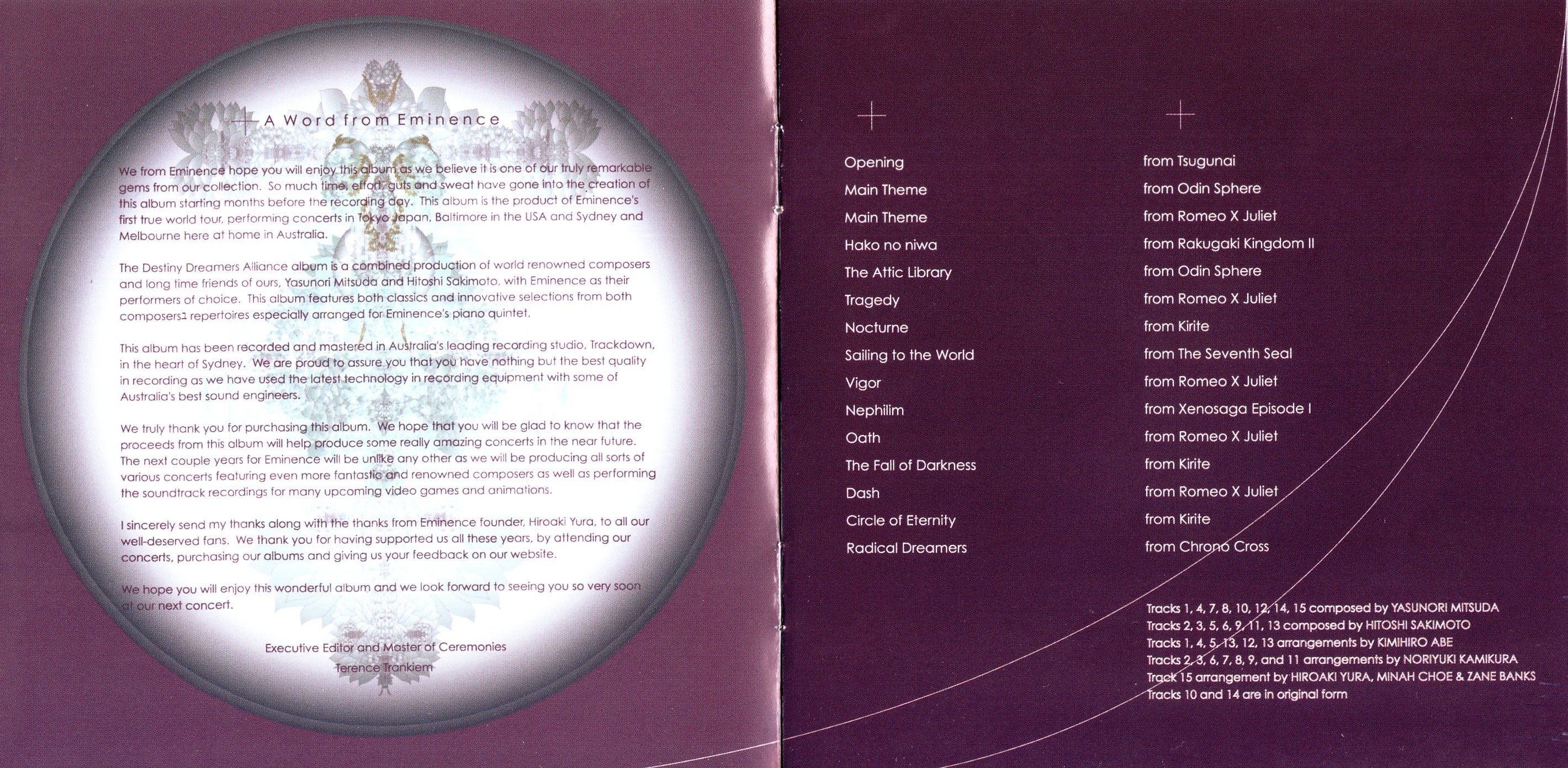 Tracks 1, 4, 7, 8, 10, 12, 14, 15 composed by YASUNORI MITSUDA.