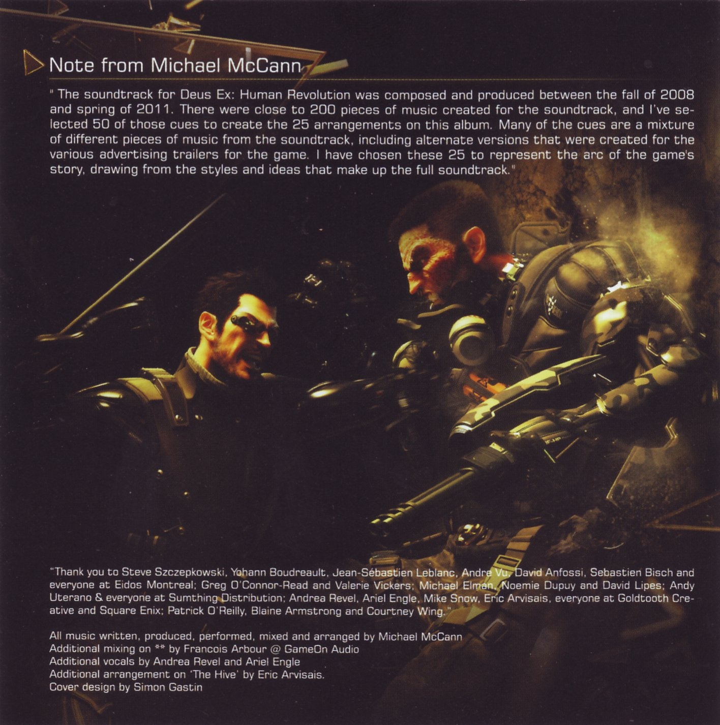 "Thank you to Steve Szczepkowski, Yohann Boudreault, Jean-Sébastien Leblanc, Andre Vu, David Anfossi, Sebastien Bisch and everyone at Eidos Montreal; Greg O'Connor-Read and Valerie Vickers; Michael Elmen, Noemie Dupuy and David Lipes; Andy Uterano & everyone at Sumthing Distribution; Andrea Revel, Ariel Engle, Mike Snow, Eric Arvisais, everyone at Goldtooth Creative and Square Enix; Patrick O'Reilly, Blaine Armstrong and Courtney Wing."