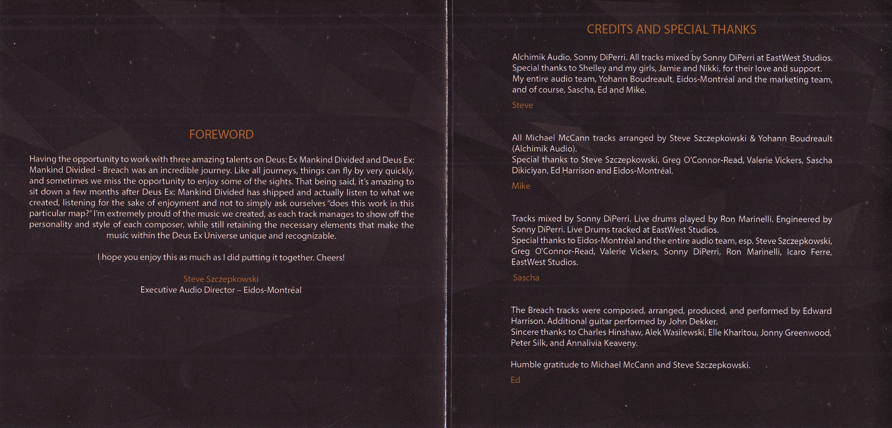 Special thanks to Shelly and my girls, Jamie and Nikki, for their love and support. My entire audio team, Yohann Boudreault, Eidos-Montréal and the marketing team, and of course, Sascha, Ed and Mike.
