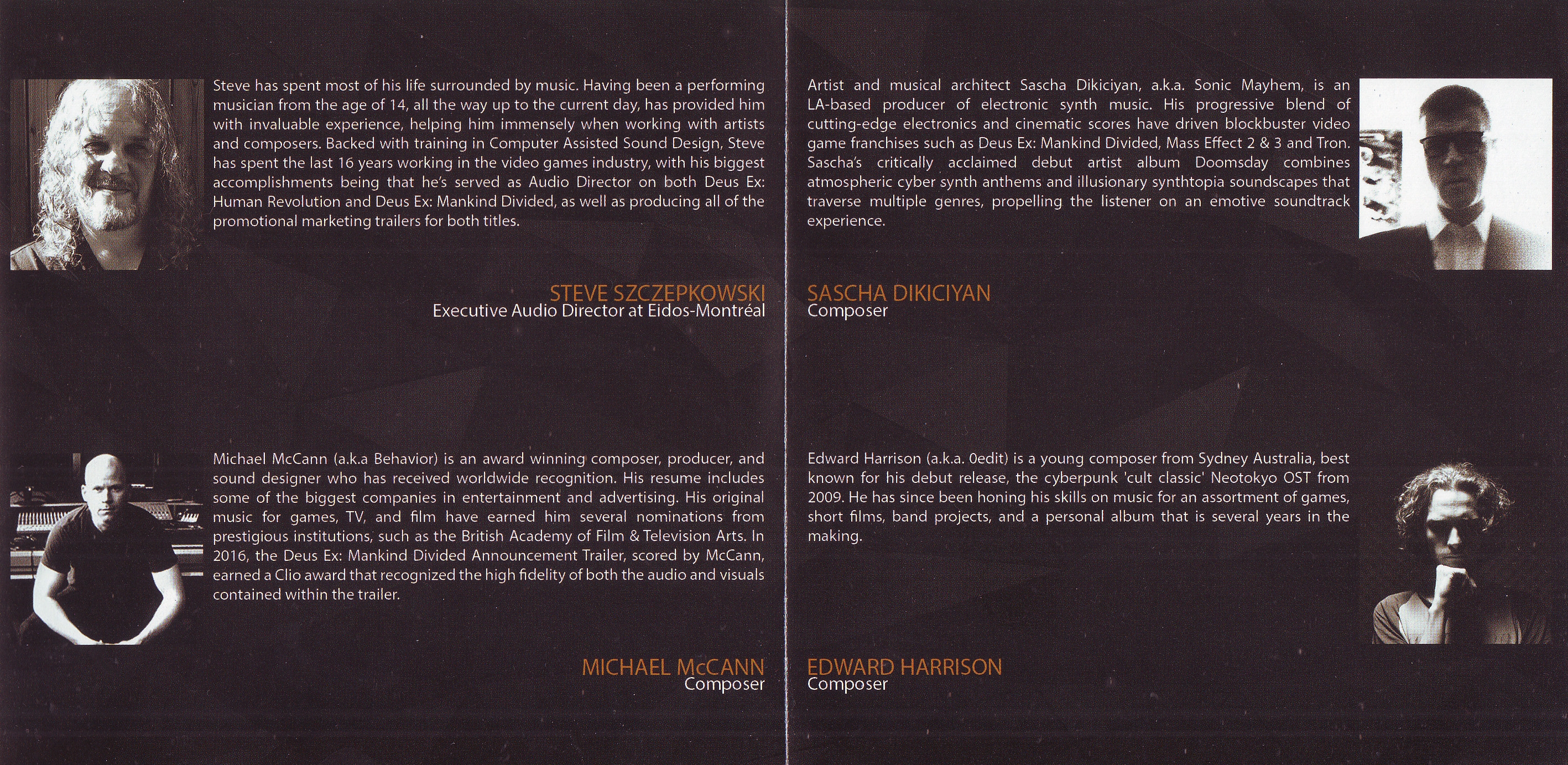 Special thanks to Eidos-Montréal and the entire audio team, especially Steve Szczepkowski, Greg O'Connor-Read, Valerie Vickers, Sonny DiPerri, Ron Marinelli, Icaro Ferre, EastWest Studios.