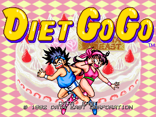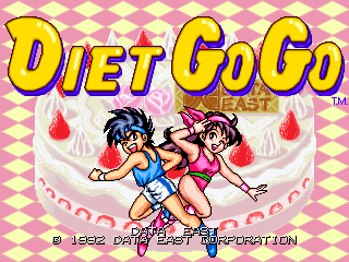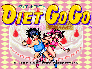 Diet Go Go is 2D platform game "on single screen", similar to Nightmare in the Dark or Jumping Pop. Players control two anime-styled teenagers (a boy and girl) wearing gym gear. They must shoot some monsters - after shooting the monsters a few times the enemies become fat and can be easy killed, and used as missile to kill other enemies. If the player defeats all enemies, he will go to the next level.