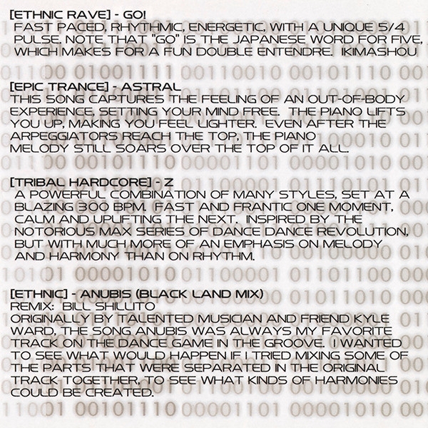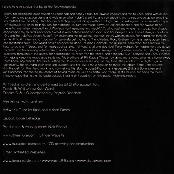 Oh, and for jellyfish, Jason Rudolf, for challenging me to always try new things with my music, for helping me through some difficult times, and of course for generally getting high off enchiladas, Ricky Graham, for his amazing guitar talent and mastering skills, Snowlind never sounded so good. Pejman Roozbeh, for giving me inspiration, for teaching me how to do drum'n'bass, and for really cool samples, Virtuosi shall one day rise! Tora Mulligan, for helping me stay down to earth, for his amazing artistic talent, and for being someone I could always turn to when I needed to talk. My various teachers throughout the years, for teaching me to reach for the stars, and especially Sue Tromblee and Carol Doemel, for helping keep the music alive inside me. My brothers at Phi Kappa Theta, for giving me a home, a home, a home away from home. My friends, for never letting me down and never leaving me. My fans, the people of the rhythm game community, for showing their love and support, and for giving me a reason to make this album. Eddie Lehecka and Nick Randall, for their hard work, and for making this album a possibility, Konami, especially Stillwind Borenstein and Jun Funahashi, for making my dream of having music on DDR a reality. And finally, Jeff DeLuca, for being my muse, in more ways than either he could possibly imagine or I could list on this page. Aishiteru, nequto.