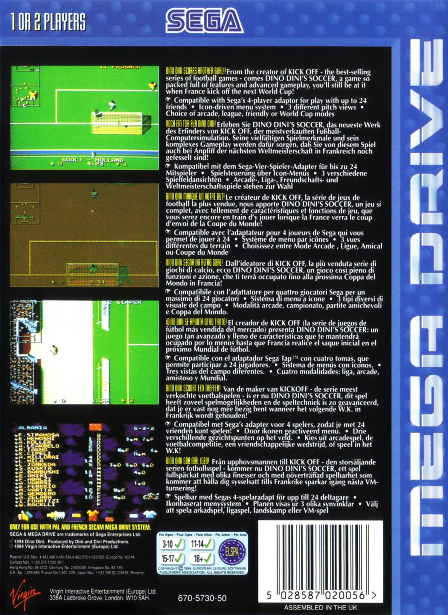 DINO DINI SCORES ANOTHER GOAL!! From the creator of KICK OFF - the best-selling series of football games comes DINO DINI'S SOCCER, a game so packed full of features and advanced gameplay, you'll still be at it when France kick off the next World Cup!