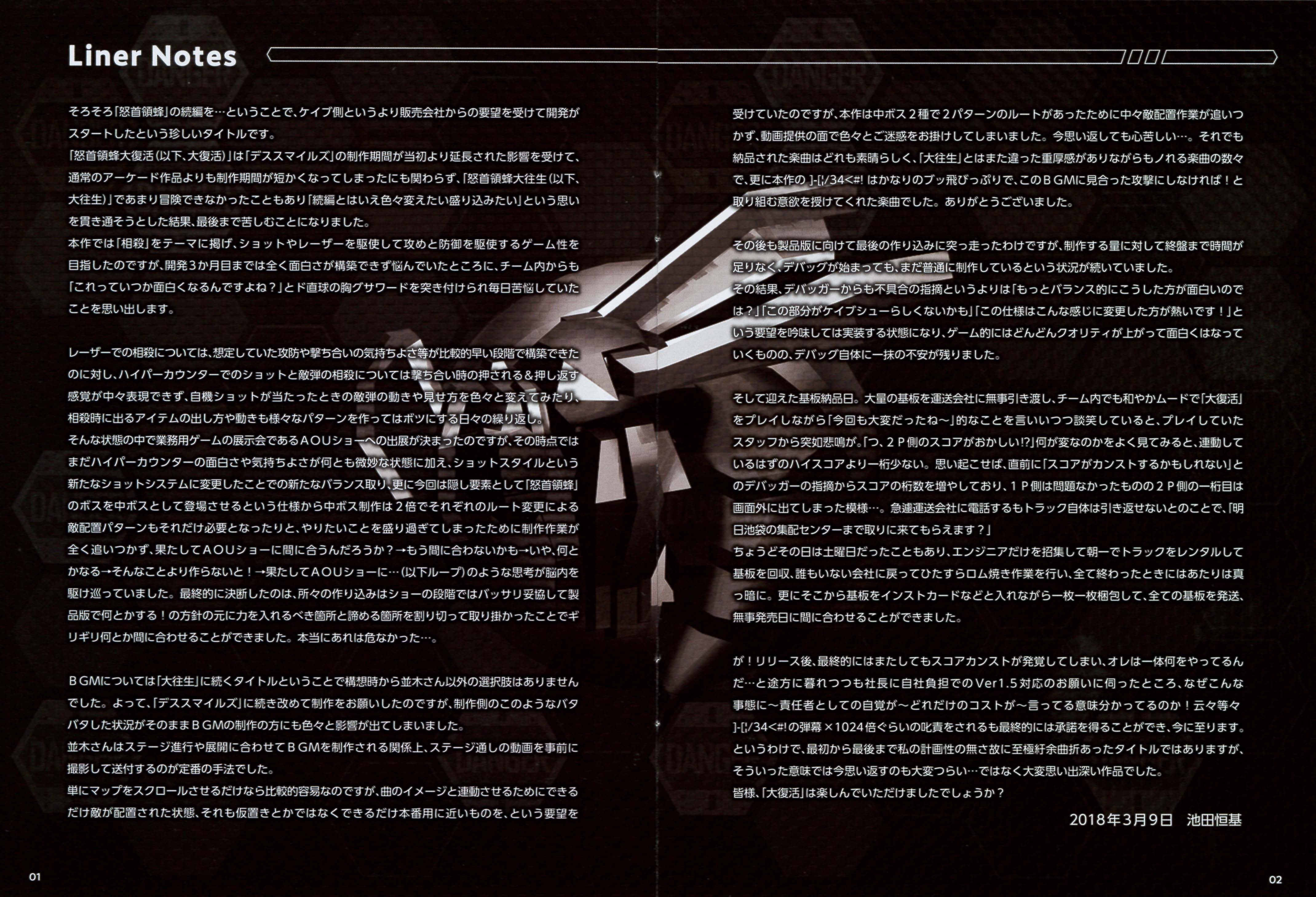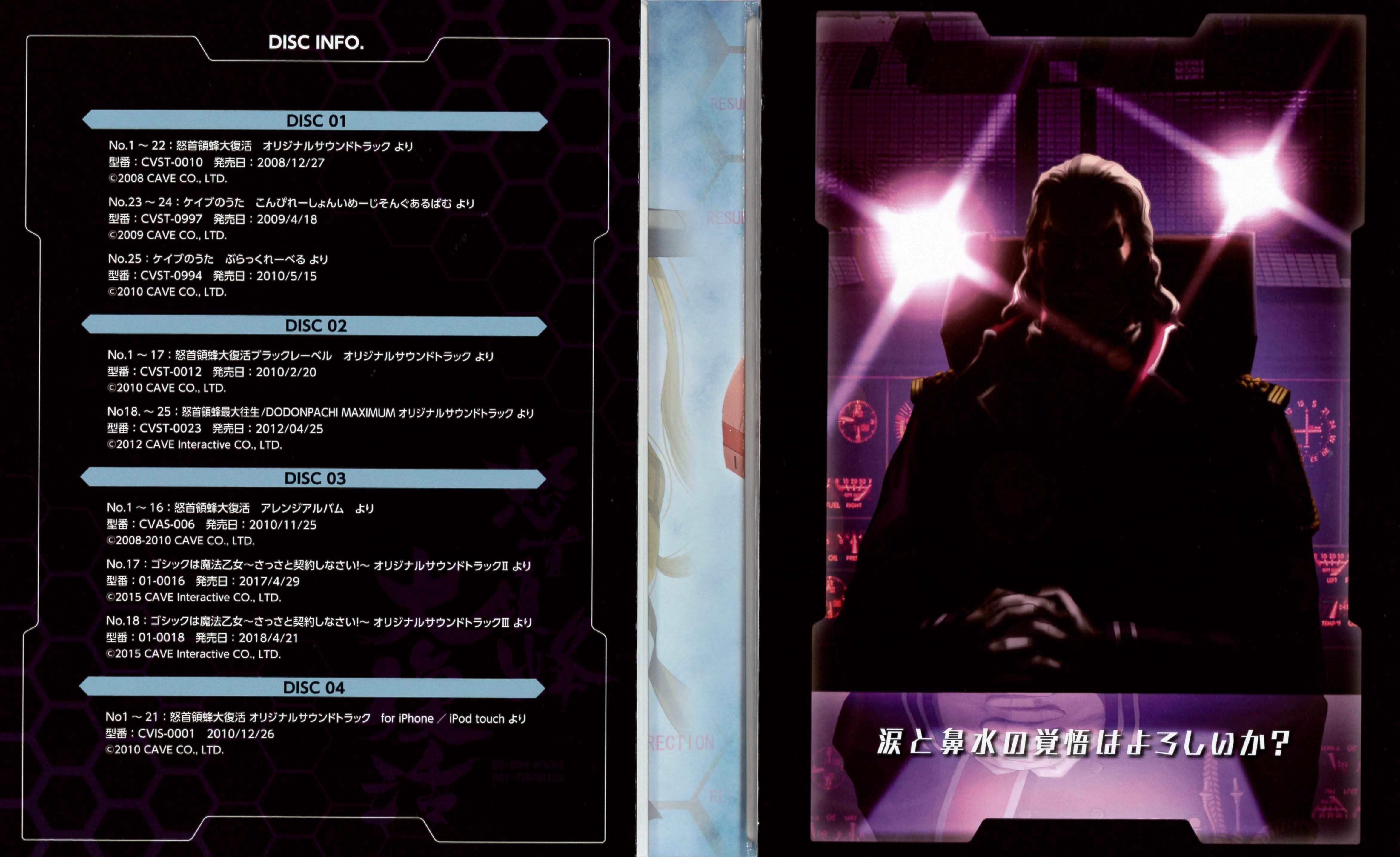 Sold at the Cave Matsuri 2018 event held on April 21, 2018 at Akiba Square in the Akihabara UDX building. Compilation of DoDonPachi Daifukkatsu soundtracks and arrangements.