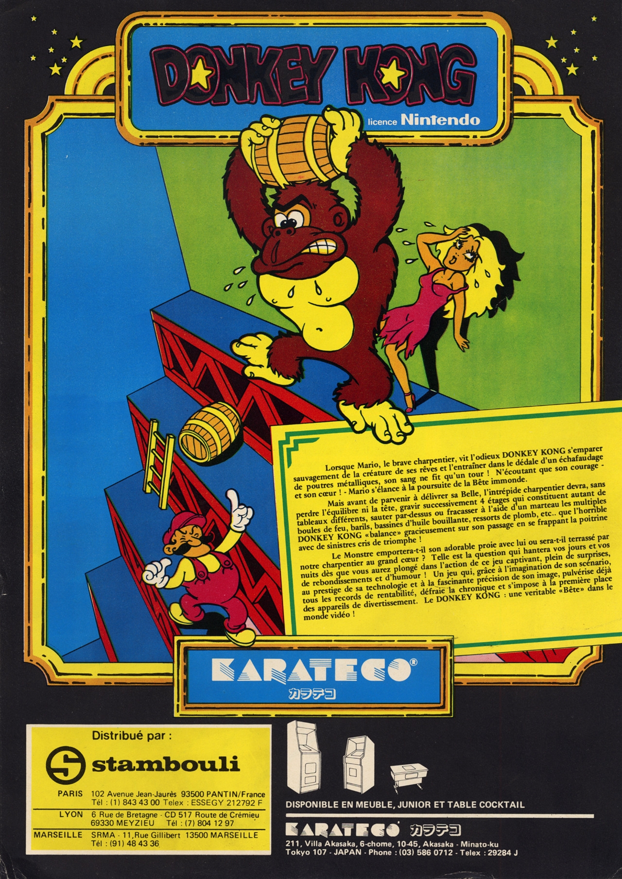 Following 1980's Space Panic, Donkey Kong is one of the earliest examples of the platform game genre, even prior to the term being coined; the U.S. gaming press used "climbing game" for games with platforms and ladders. As the first platform game to feature jumping, Donkey Kong requires the player to jump between gaps and over obstacles or approaching enemies, setting the template for the future of the genre. With four unique stages, Donkey Kong was the most complex arcade game of the time, and one of the first arcade games with multiple stages, following games such as 1980's Phoenix and 1981's Gorf and Scramble.