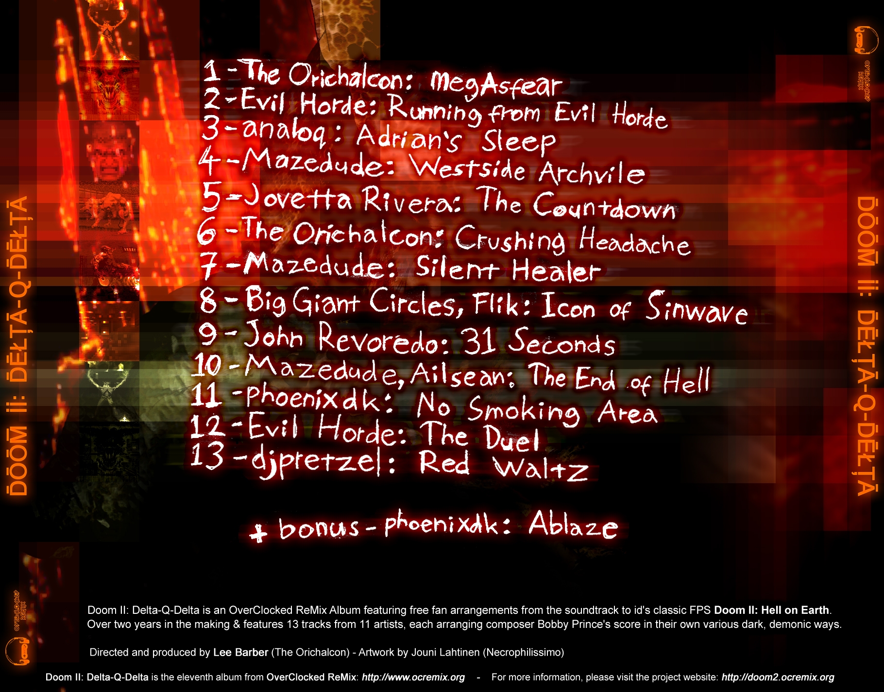 Directed by ReMixer and former OC ReMix Judge Lee Barber (The Orichalcon), Doom II: Delta-Q-Delta is the eleventh album from OverClocked ReMix. Lee was also instrumental in OC ReMix's fifth album, The Dark Side of Phobos, which arranged music from the first Doom.