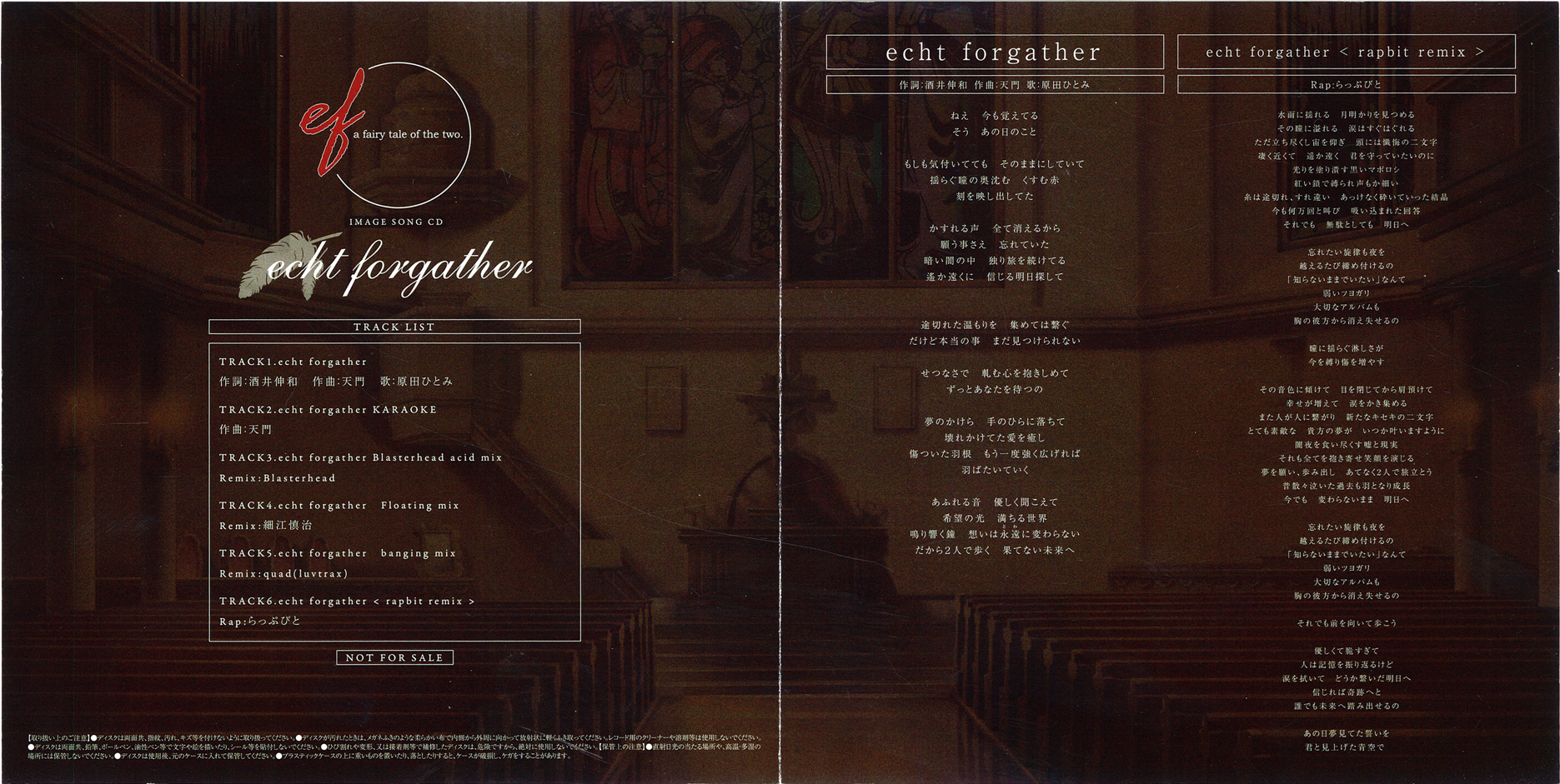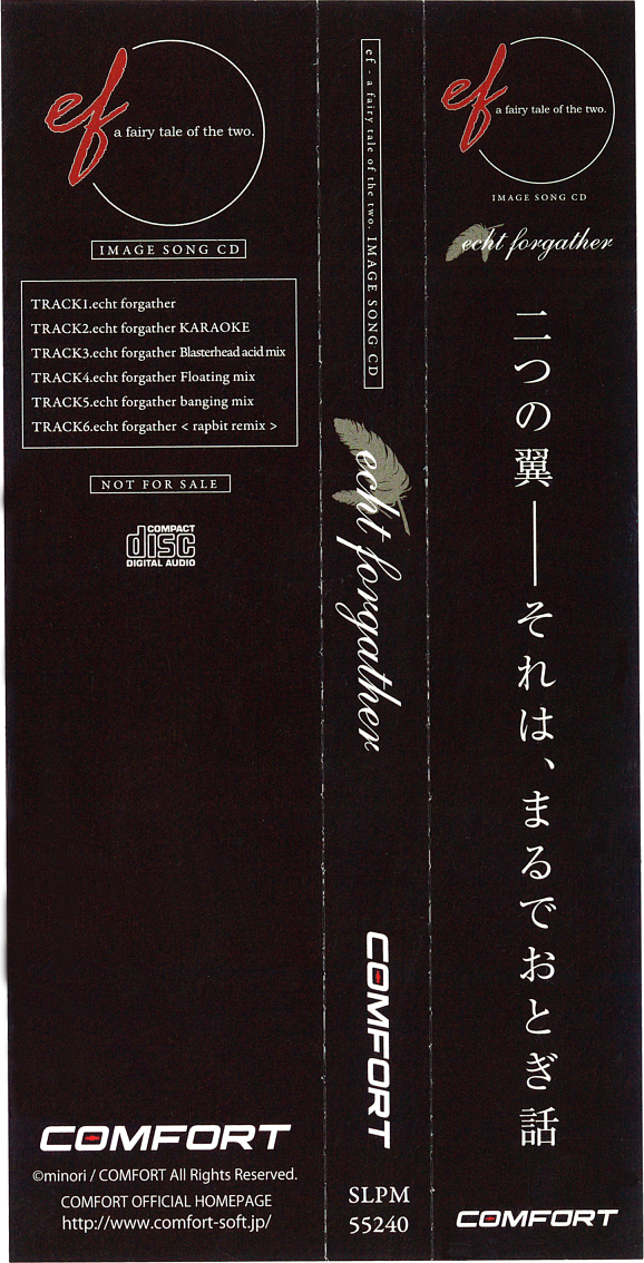 Comes with the limited edition of the game and contains "echt forgather" (an image song for the PS2 port of ef - a fairy tale of the two.) and the four remix tracks of this song.