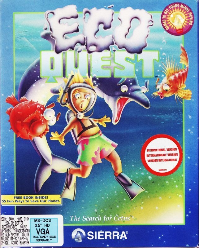 The last of Sierra's various Quest series, EcoQuest is designed to teach about the importance of environmental ethics. The games are considerably easier than most Sierra adventures and cannot be lost or rendered unwinnable. Both use a fully mouse-driven version of SCI1, in the manner of Space Quest IV and King's Quest VI. The Search for Cetus was released first on floppy disk, then on CD-ROM with full speech in 1992.