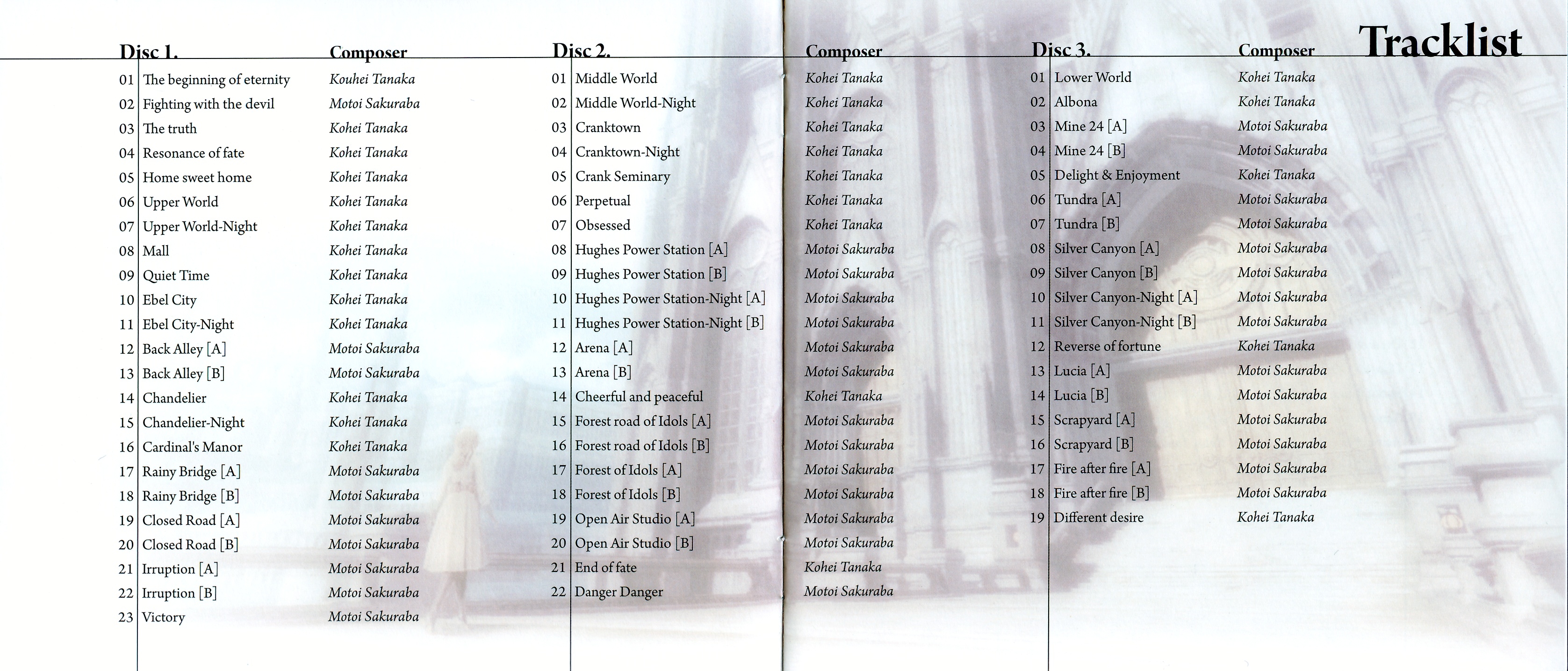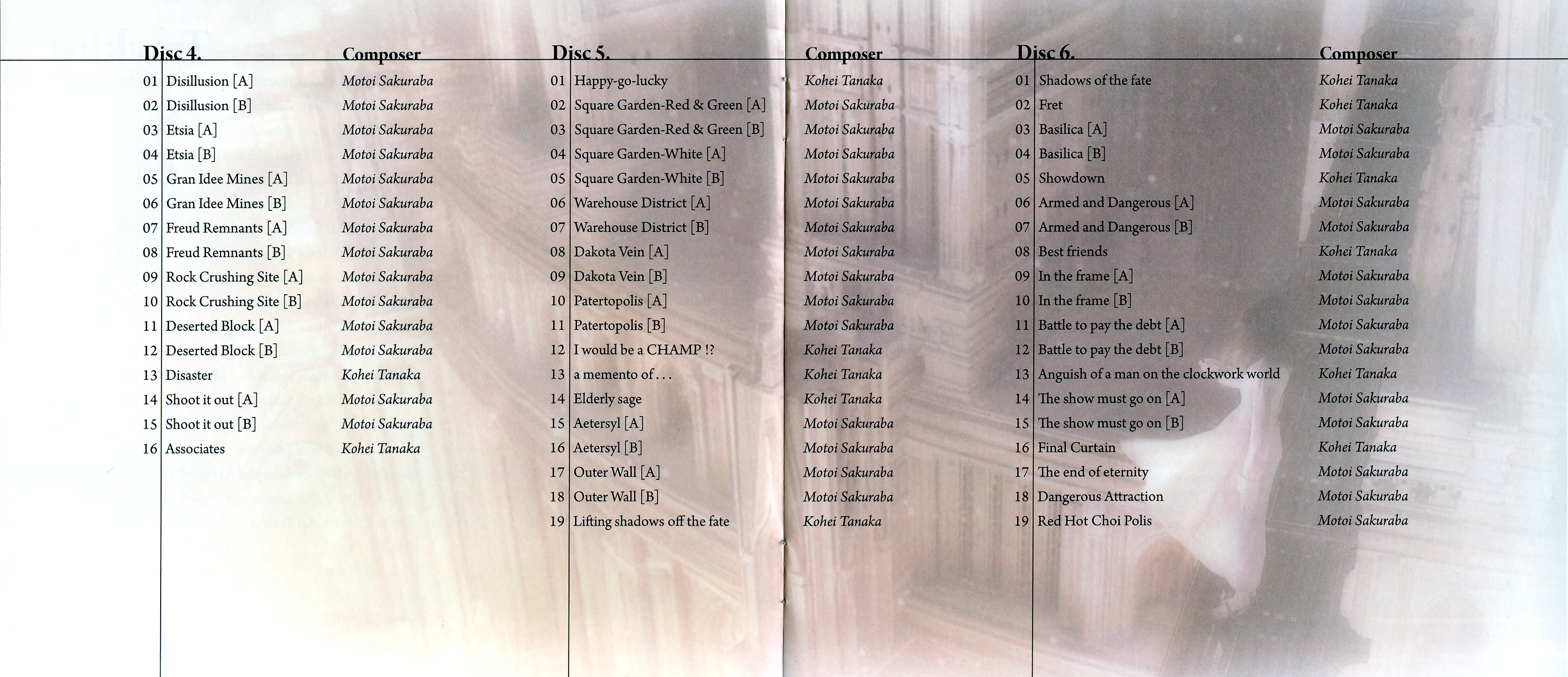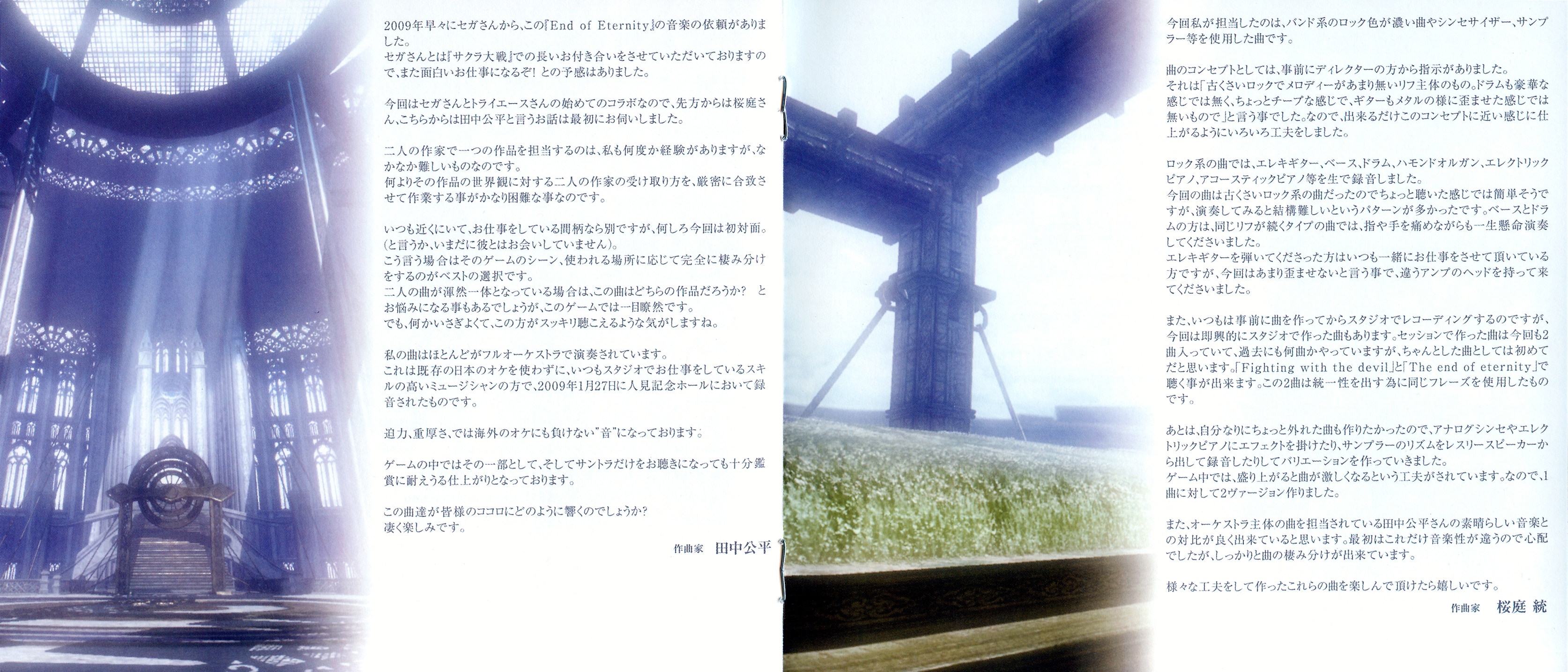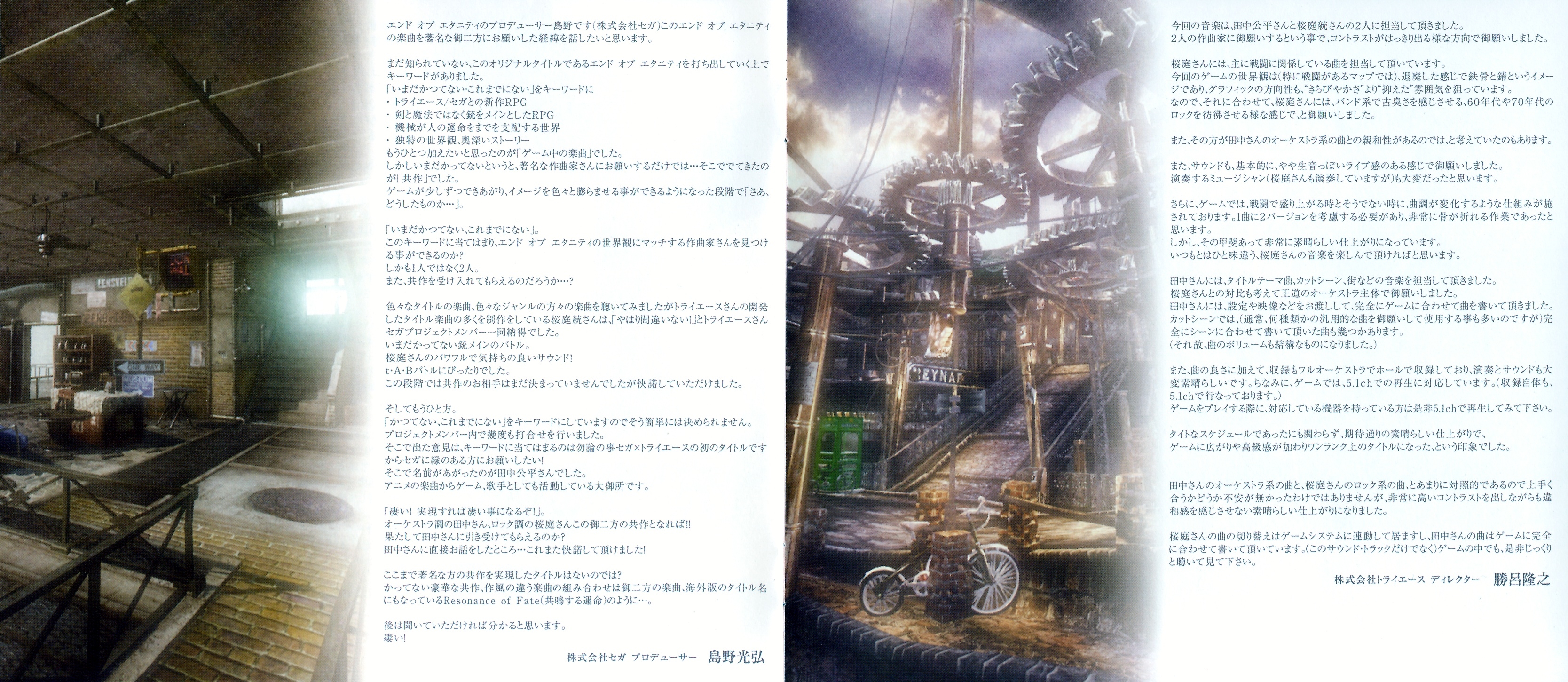 Liner Notes: Kohei Tanaka (Composer) (pg. 5), Motoi Sakuraba (Composer) (pg. 6), Mitsuhiro Shimano (Producer) (pg. 7), Takayuki Suguro (Director) (pg. 8)