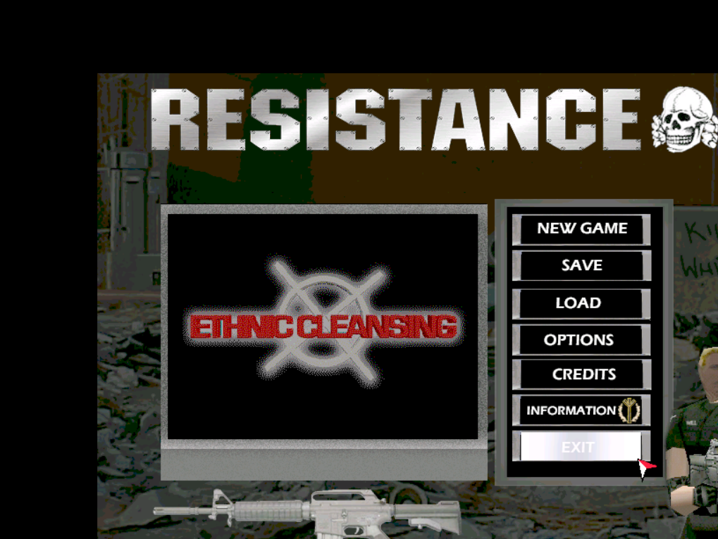 In this first-person shooter, you play either a skinhead with a gun or a Klansman with a rope. The game has two levels. In the first level, you must run through a ghetto shooting blacks and Latinos. In the second level, you must run through a subway system shooting stereotypical Jewish people. In order to beat the game, you must defeat Ariel Sharon.