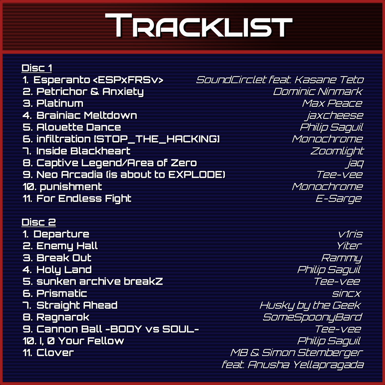 All tracks are mixed by their respective arrangers, unless otherwise stated.