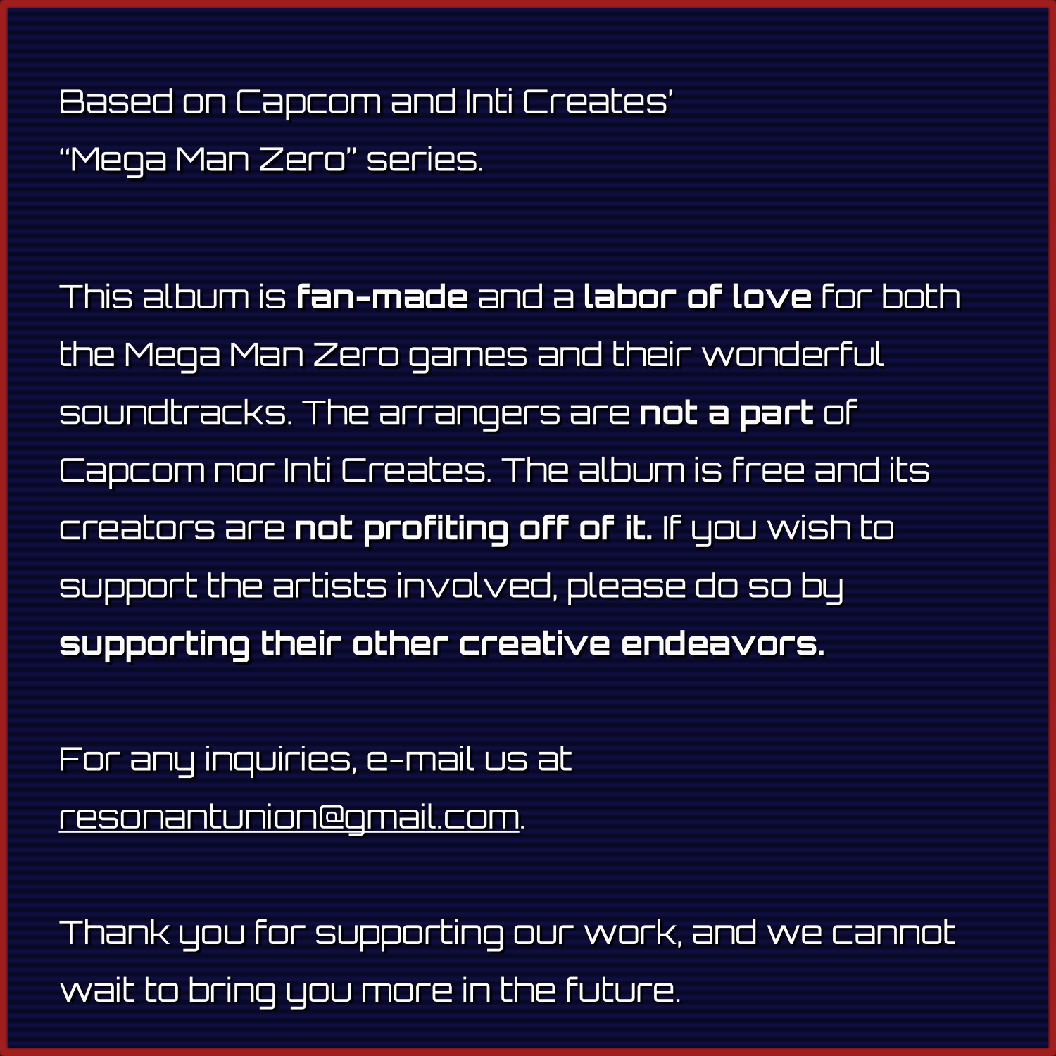 Includes a motif from “ZERO” from Mega Man X, composed by Setsuo Yamamoto