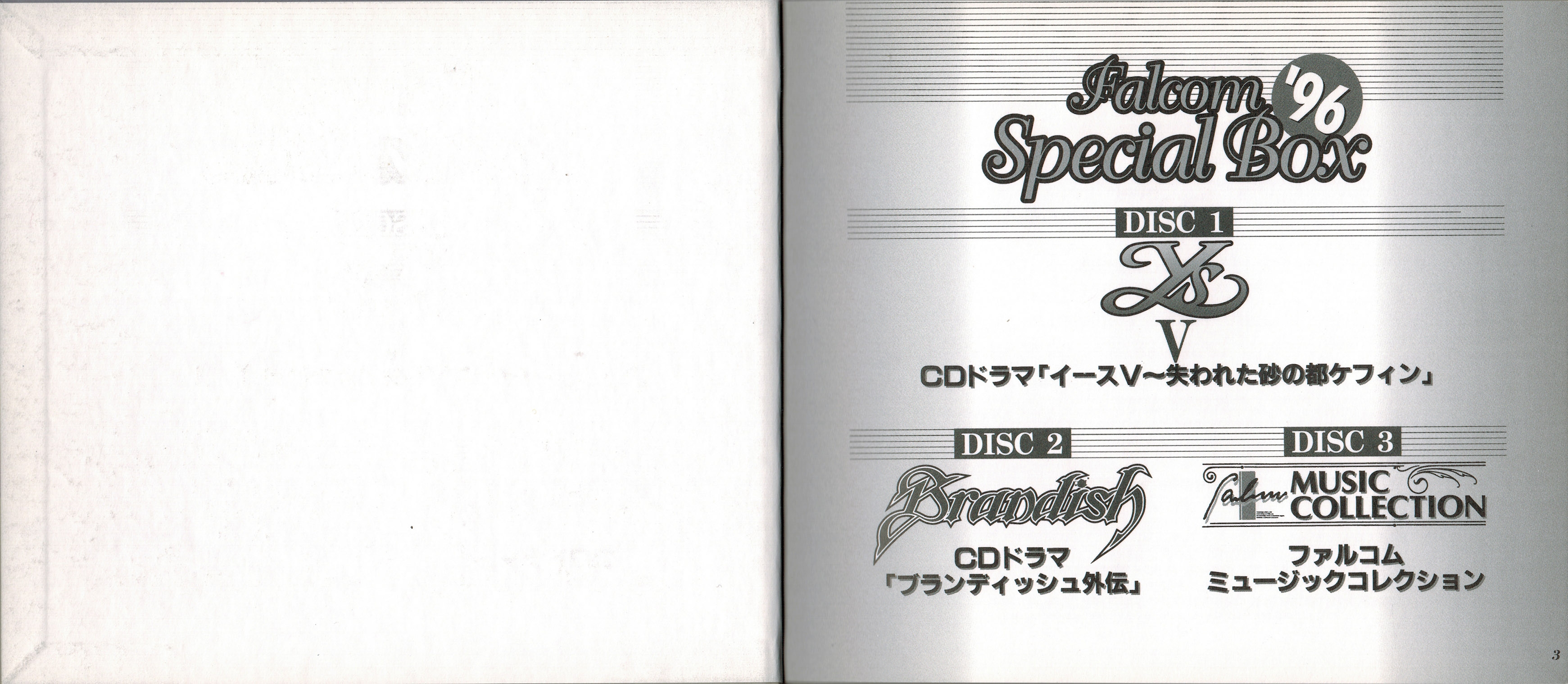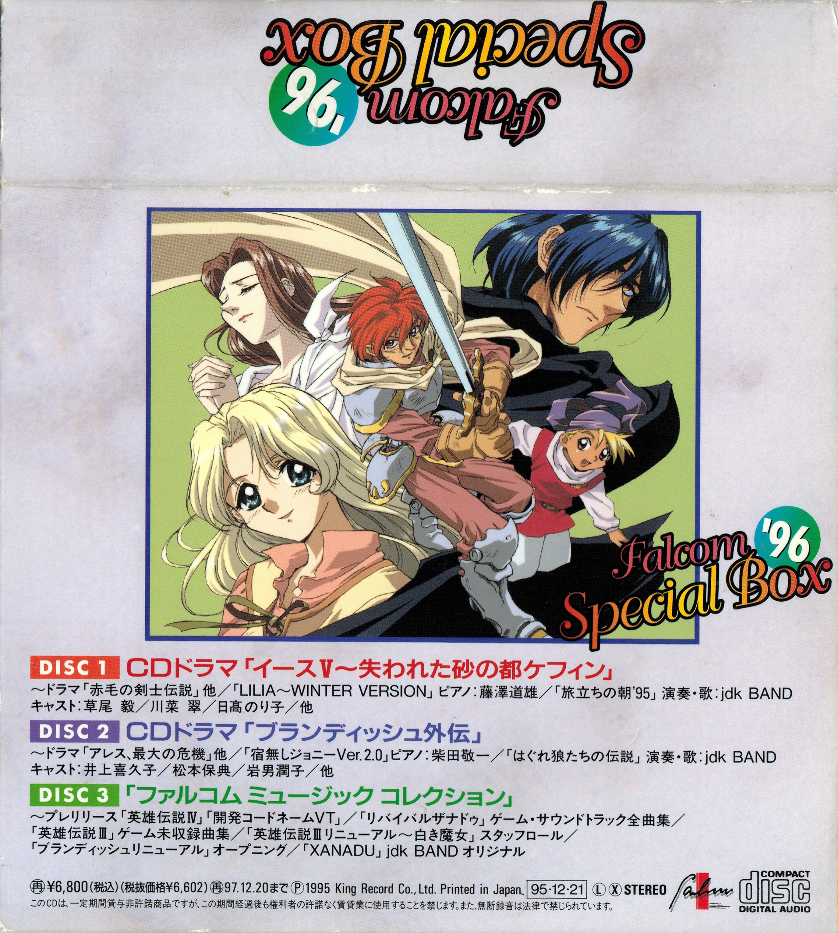 Falcom Special Box '96 is a compilation of music and drama from various Falcom games spread across three special volumes. This is the eigth produced 'Falcom Special Box' volume.