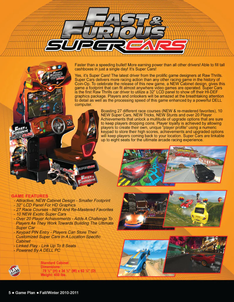 Fast & Furious: SuperCars features 27 tracks, 10 licensed cars, can be linked to 8 locations, and includes a PIN account system to store player records.