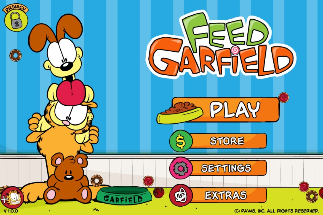 Feed Garfield is a physics puzzle where player has to feed Garfield the cat with food, while also collecting lasagnas. Its gameplay is similar to that of Zeptolab's Cut the Rope and Rovio's Angry Birds and Amazing Alex.