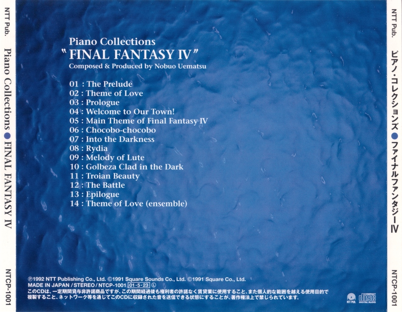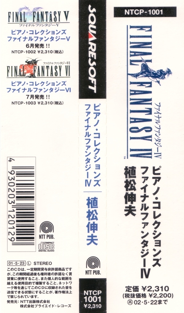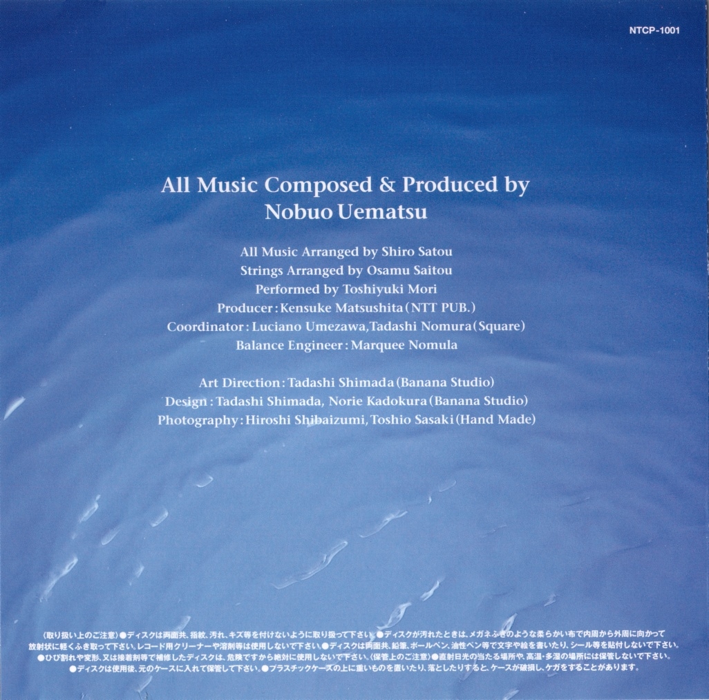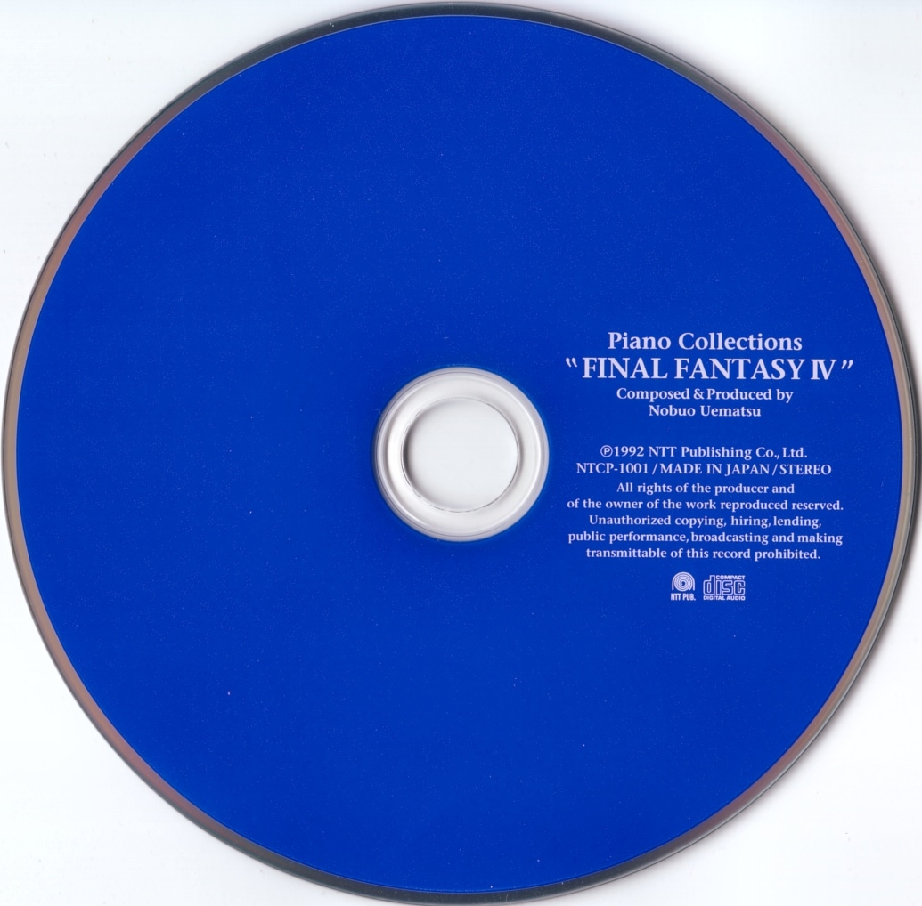The N38D-010 and PSCN-5008 releases are contained in hardcover books with a plastic cover. The hardcover book includes piano scores, notes for each piece, and black and white drawings by Yoshitaka Amano. The NTCP-1001 release, however, comes in regular CD case.