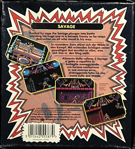Fired by rage, Savage plunges into an battle of violence, destroying all who stand in his way. Savage enters the Valley of Death, where a 3D viewpoint allows him to scan the horizon and plot a path through the grotesque monoliths. Savage summons his trusty Eagle Warrior and using a telepathic link flies him into the labyrinth to rescue his maiden! Can you be the supreme fighting machine... SAVAGE!