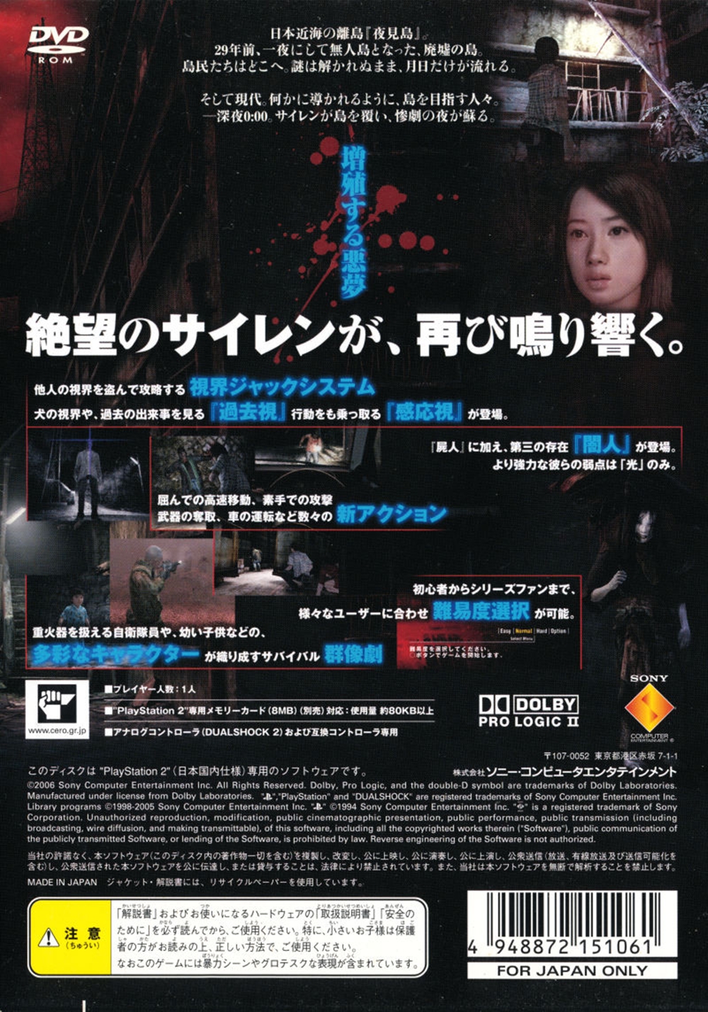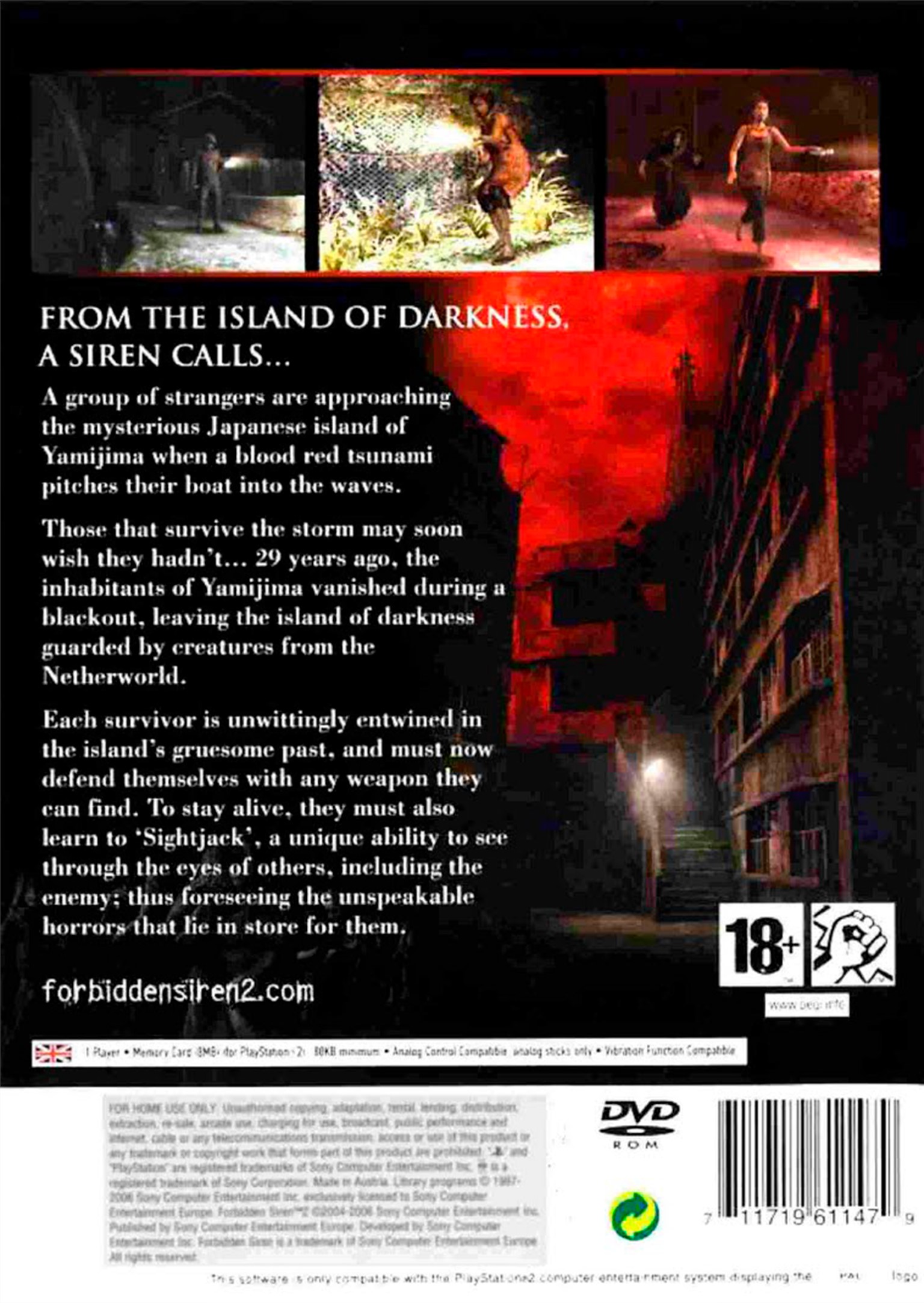Forbidden Siren 2 is a haunting tale set on the island of Yamijima. The story starts as a group of characters are washed up on the island's shore after their boat is caught in a violent storm. Unbeknown to them, 29 years earlier all the inhabitants of the island mysteriously disappeared in a black-out. Up until now the events of that ill-fated night remain unsolved. But as the chilling sound of a warning siren rings out over the island, the castaways are faced with the awakening of the Shibito (living dead) and the Yamibito (people of the dark). To survive the island, players need to use light to their advantage. Both the Yamibito and Shibito are sensitive to light - but in opposing ways. To wipe out the Yamibito players need to turn lights on but, to escape the Shibito players need to eliminate light, smashing street lamps, or hiding in the darkness. Players can also use a variety of weapons to dispose of their enemies as well as running them down by using abandoned vehicles.