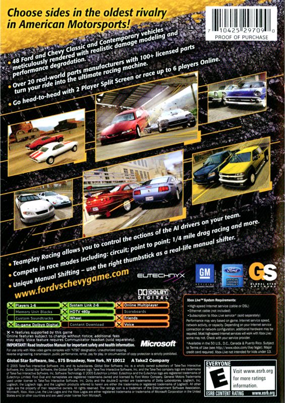 Pick your side, either Ford or Chevy, and compete in circuit races, point to point races, time trials, drag races, and other events. Work with your teammates to gain a leg up on your opponents by choosing when to play aggressively and ram them to gain position and when to block them from trying to steal your position. Tweak your car to get the most performance possible by getting over a hundred parts from over twenty manufacturers.