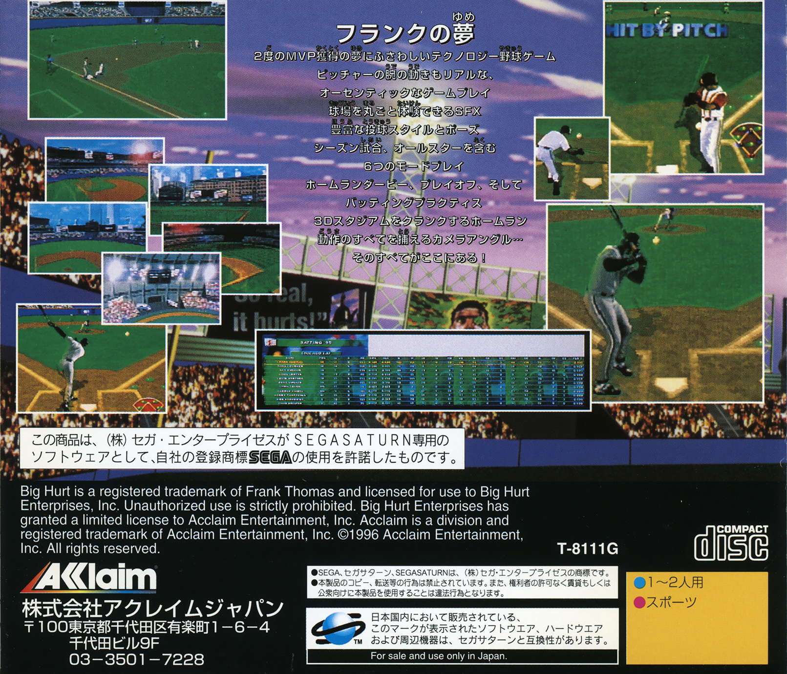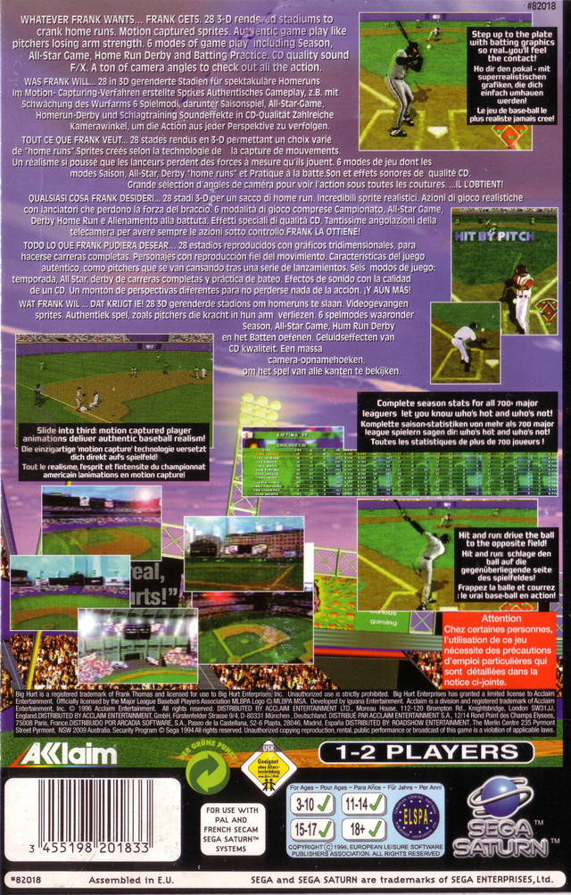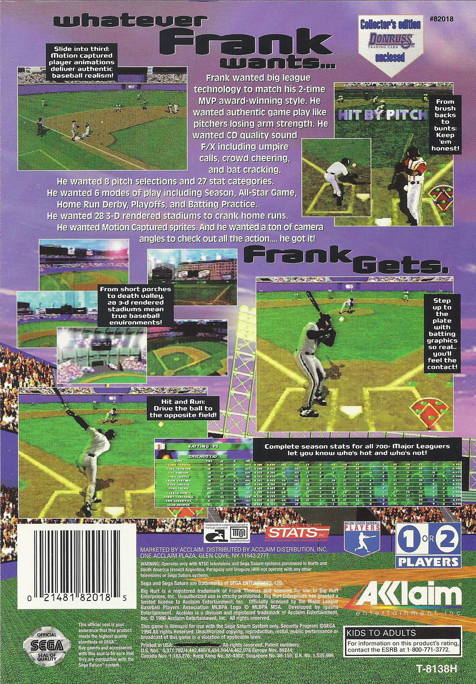 Frank wanted big league technology to match his two-time MVP award-winning style. He wanted authentic gameplay like pitchers losing arm strength. He wanted CD-quality sound FX including umpire calls, crowd cheering and bat cracking. He wanted 8 pitch selections and 27 stat categories. He wanted 6 modes of play including Season, All-Star Game, Home Run Derby, Playoffs, and Batting Practice. He wanted 28 3D rendered stadiums to crank home runs. He wanted motion captured sprites. And he wanted a ton of camera angles to check out all the action... he got it!